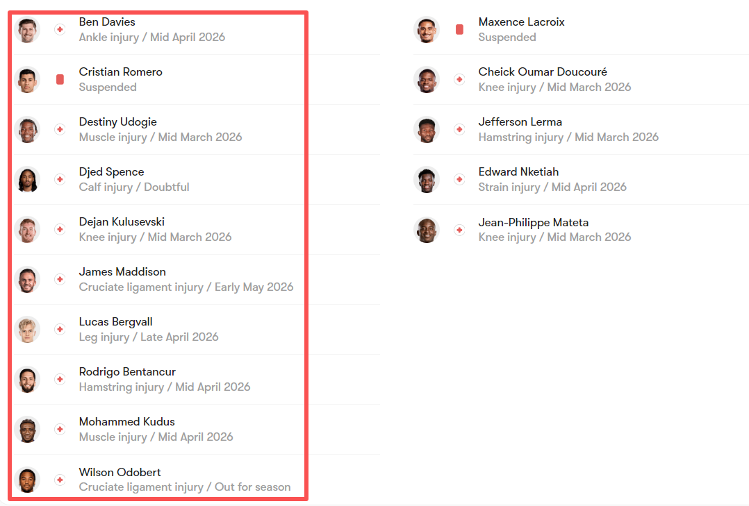 热刺的伤停名单堪称灾难级,11名一线队球员因伤或停赛缺阵,三条线均遭重创:中前场核心麦迪逊、库卢塞夫斯基、本坦库尔、库杜斯集体缺阵,导致进攻组织完全断裂,中场传球成功率从赛季初的83%骤降至67%;后防线更是雪上加霜,主力中卫罗梅罗累停赛,乌多吉、斯彭斯等后卫伤缺,图多尔只能启用青年队球员与替补拼凑防线,防线默契度堪忧,近3场在罗梅罗缺阵时场均失球达2.3球。