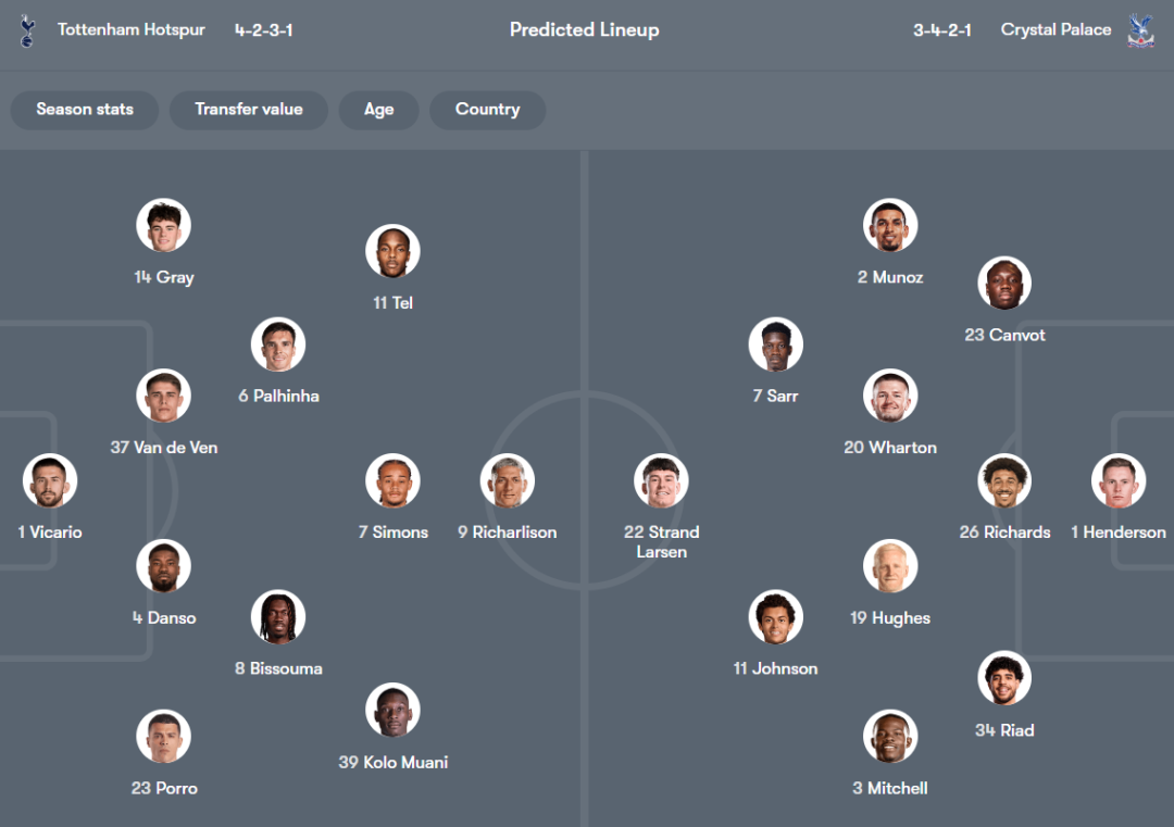 水晶宫虽有部分伤停影响,但核心框架未遭破坏:主力中卫拉克鲁瓦停赛,前锋马特塔、中场莱尔马伤缺,对进攻端终结能力有一定影响,但防守核心沃顿、门将亨德森及反击核心萨尔、均能出战。沃顿作为中场拦截屏障,近3场拦截成功率达78%,将直接对位热刺临时拼凑的中场,其防守表现将决定水晶宫反击的启动频率。相比热刺的残阵出击,水晶宫的阵容完整性足以应对客场作战。