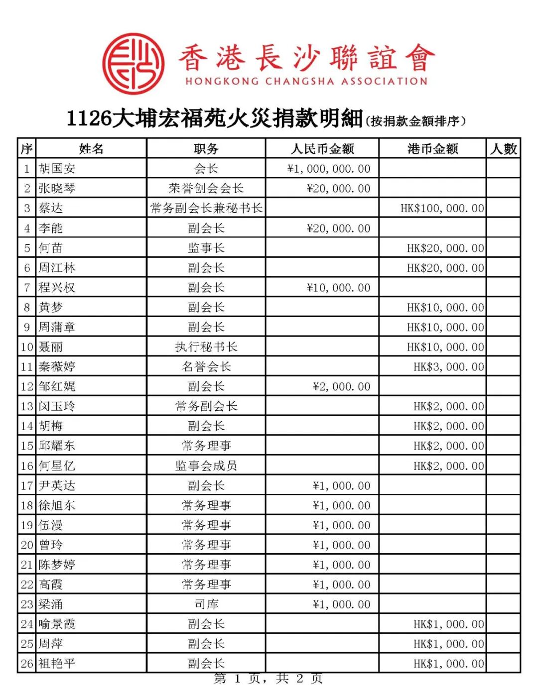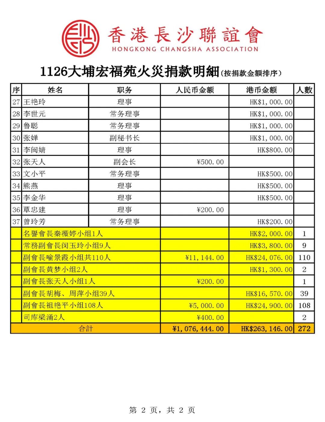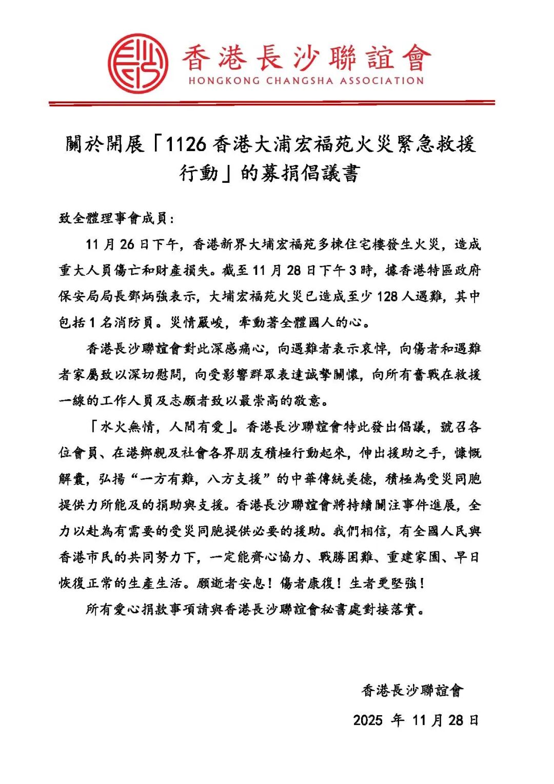 災情發生後,香港長沙聯誼會胡國安會長高度關注,協調組織資源、人力到災後臨時安置點支援善後工作。為幫助受災群眾更快地渡過艱難時刻,在11月28日發起《「1126香港大浦宏福苑火災」香港長沙聯誼會愛心募捐倡議書》,呼籲廣大會員、鄉親和朋友慷慨捐款助力受災群眾重建家園,盡快恢復正常的生產和生活。
