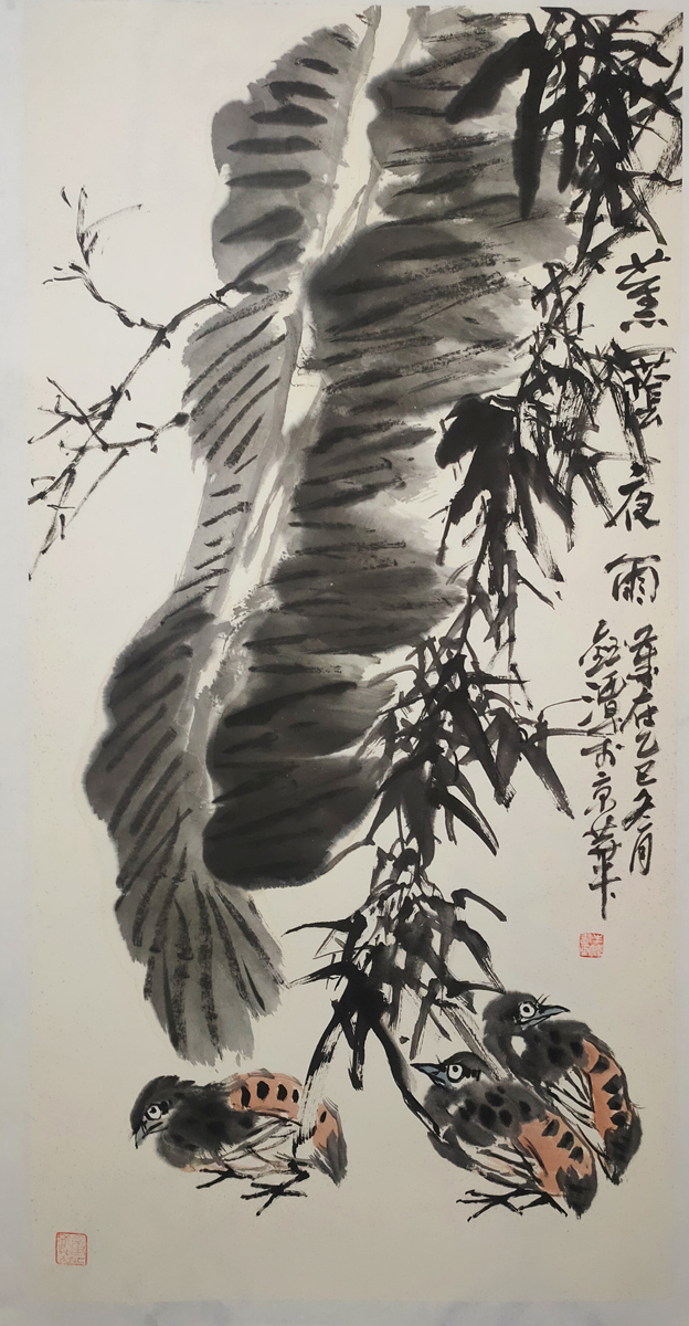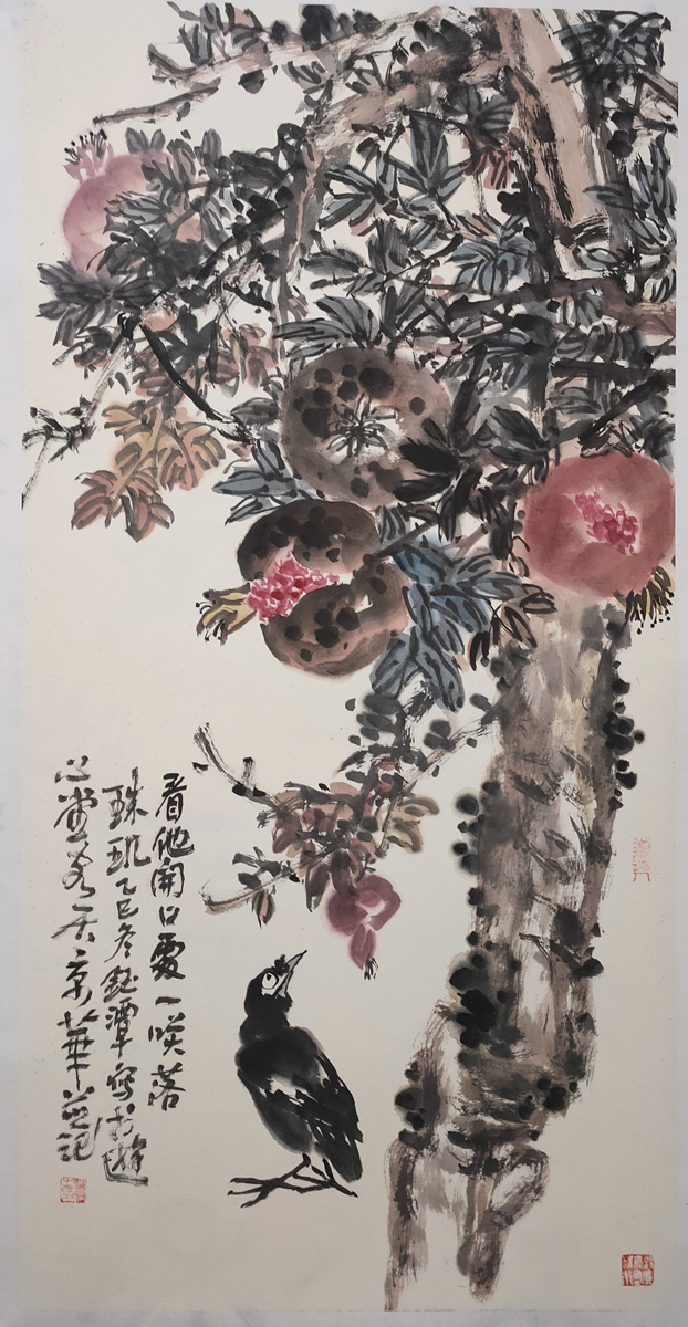 他绘草木,色是烟火的柔。《荷塘清趣》的荷,墨叶如积雨的云,浓淡间浸着湿意,粉荷似腮边的霞,轻浅里裹着羞;《榴实图》的鸟,墨羽如夜的碎,白点是月的光,仰头望榴的憨态,是院角枝头的小欢喜——丰伟的笔从不是画草木,是写草木里的生活,是把“茶烟的暖、檐角的光、巷口的笑”都揉进墨色,让每幅画都撞进观者的日常。