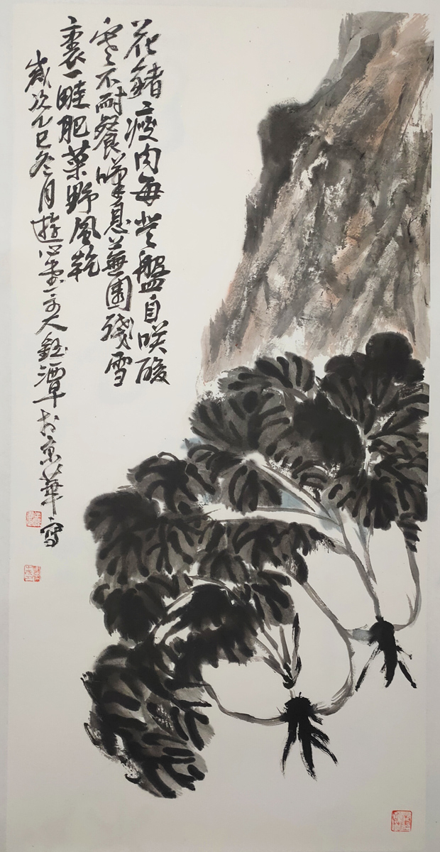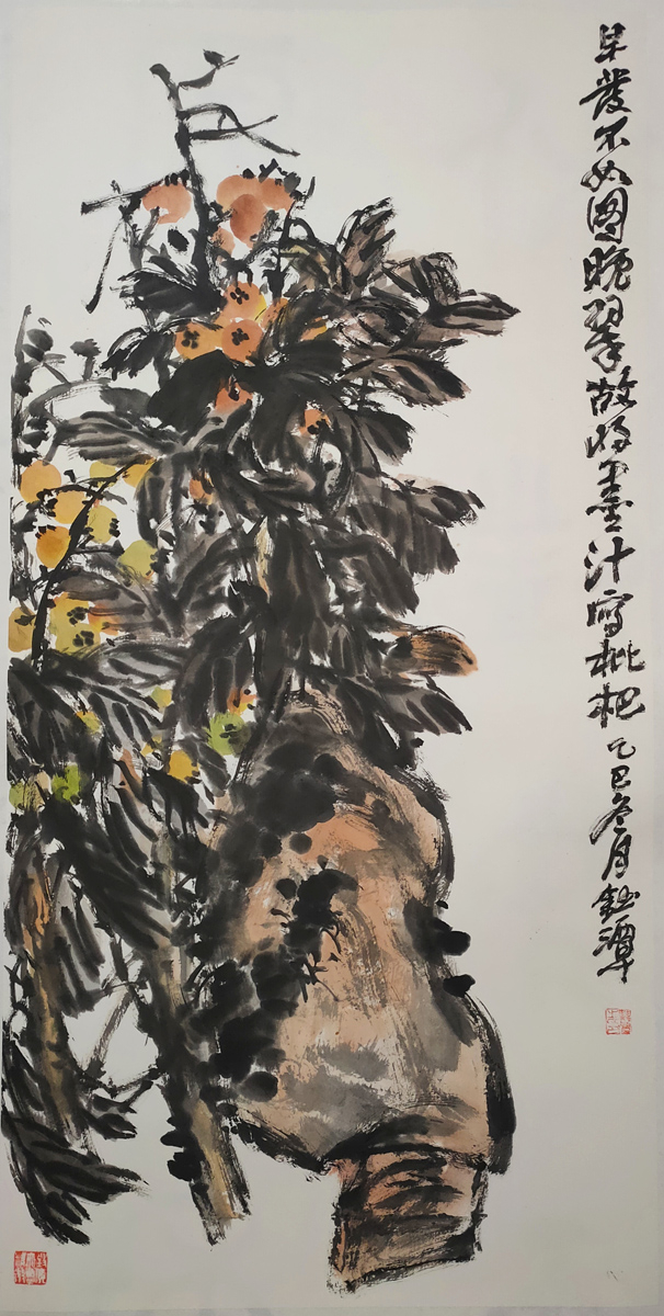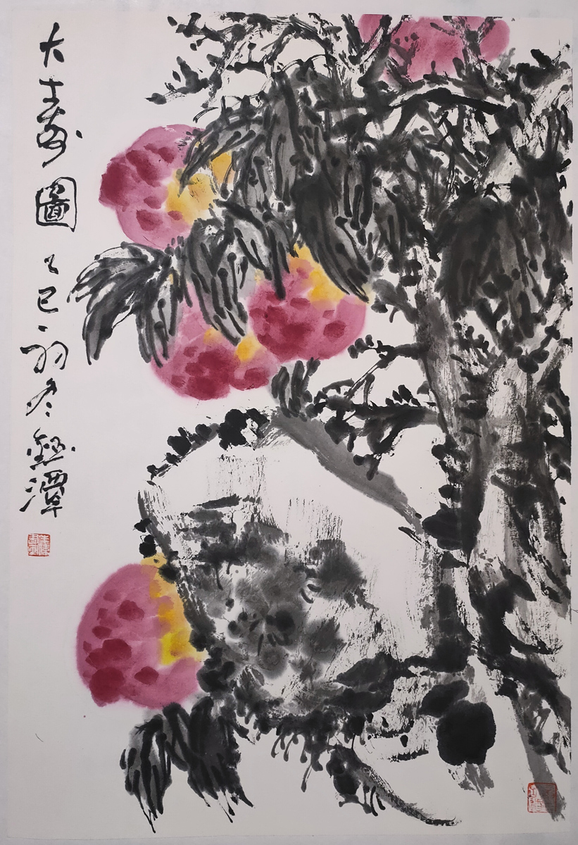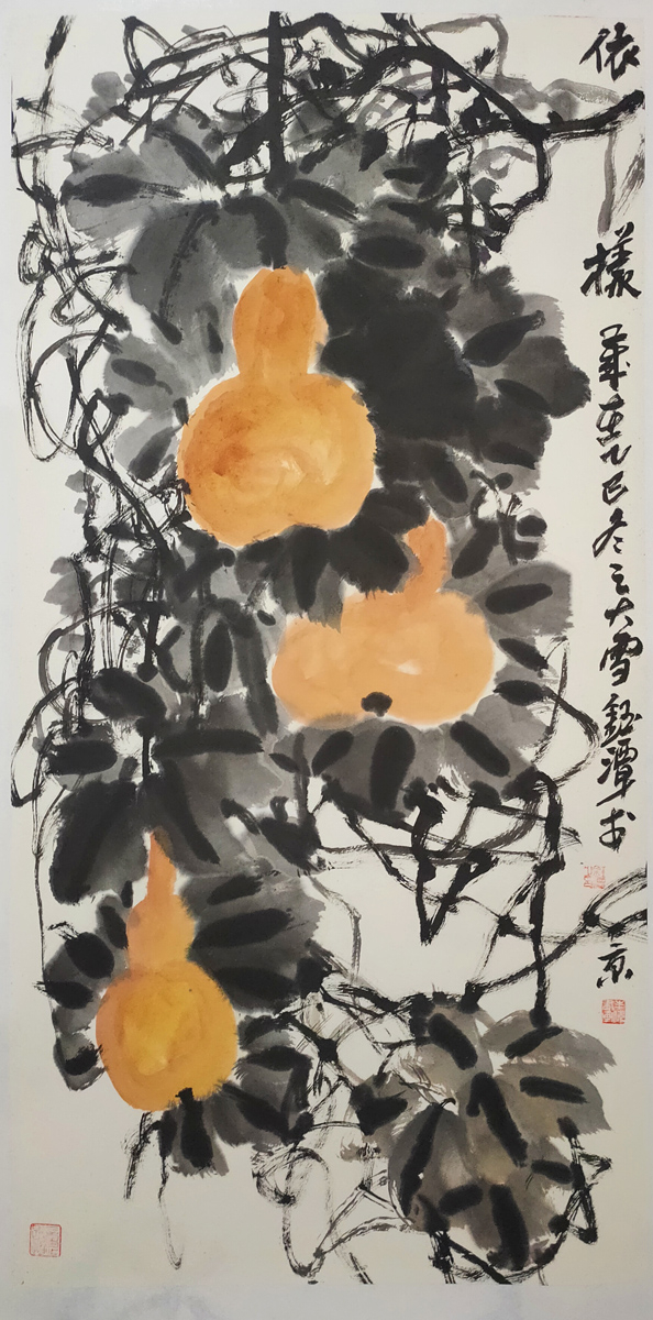 《大寿图》的桃,是憨暖的诗:墨叶如泼翻的云,焦墨的棱是风擦过叶尖的痕,浓黑裹浅灰,似暮云偎晨雾;桃色如浸软的霞,艳红叠嫩黄,像夕阳焐热了鹅绒,一笔便淌出“寿岁绵长”的软意。《依样年华》的葫芦,是安稳的梦:藤蔓是风的指纹,线条缠缠绕绕,如巷弄里牵牵连连的烟火;金黄的葫是晒透的阳,墨叶是遮阴的凉,一暖一凉间,是寻常日子的妥帖。