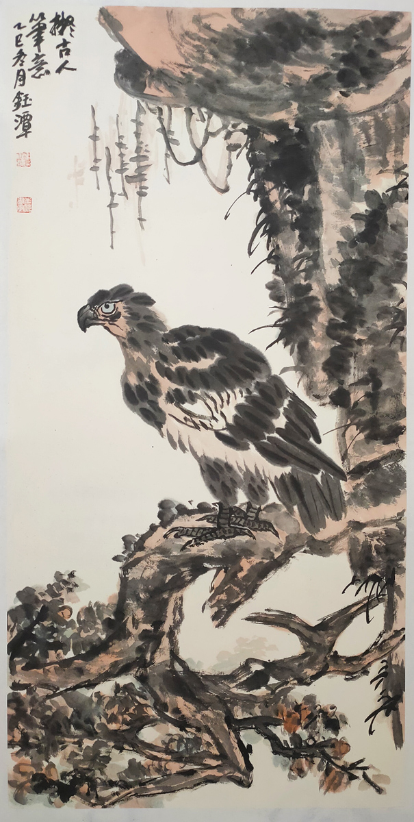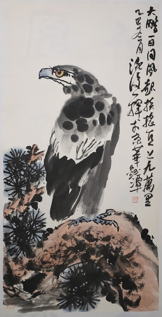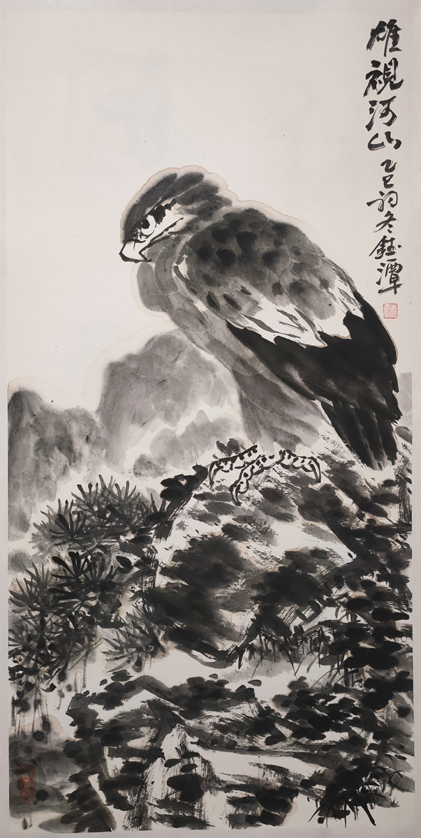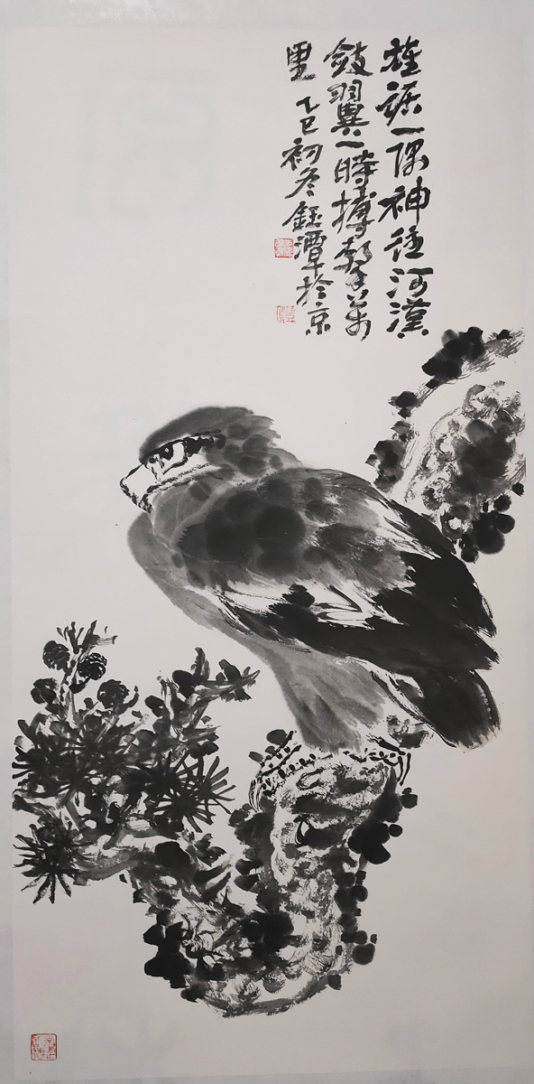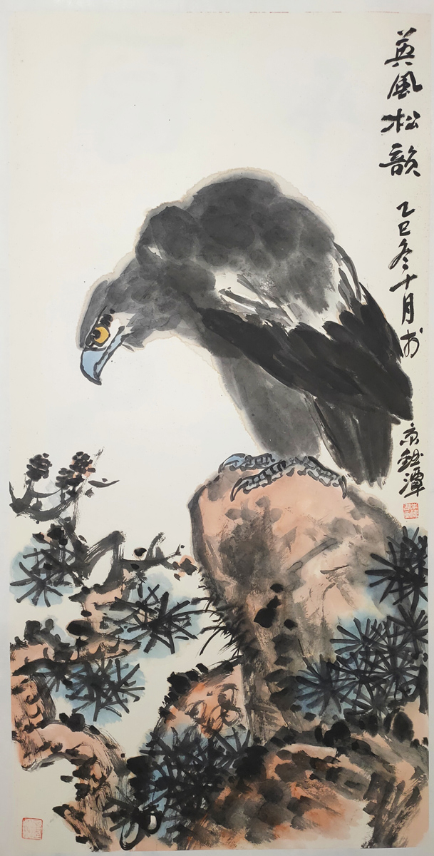 他写雄鹰,笔是惊雷的骨。《英风松韵》里,翅羽的浓墨如山的沉,飞白的轻扬似风的疾,鹰眸那点明黄,是崖尖漏下的星,凝着“振翅九万里”的劲;松针的簇簇浓黑,是石缝里攒着的韧,与鹰的雄健相和,恰是笔墨里的风骨铮铮。