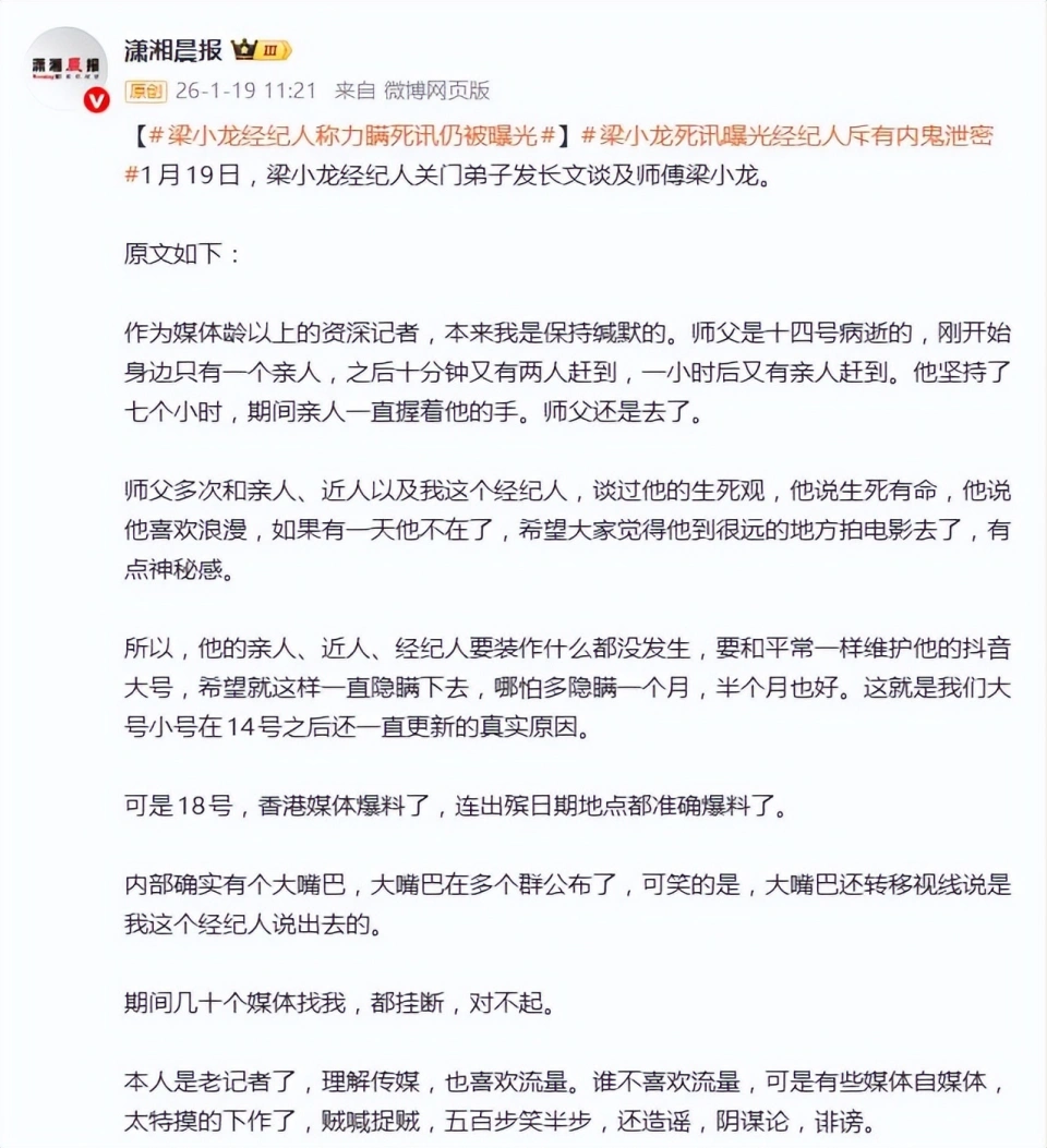1月19日,梁小龙的经纪人兼关门弟子发布长文发声,揭开了这场“浪漫告别计划”意外破局的真相:为遵从梁小龙生前“留些神秘感”的遗愿,团队本想隐瞒死讯至1月26日深圳出殡仪式后,却因内部出现“大嘴巴”,在多个私密群组泄露消息,导致港媒提前曝光,更令人愤慨的是,泄密者还刻意栽赃,将责任推给经纪人。