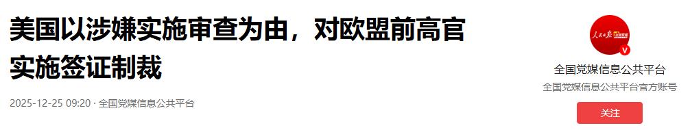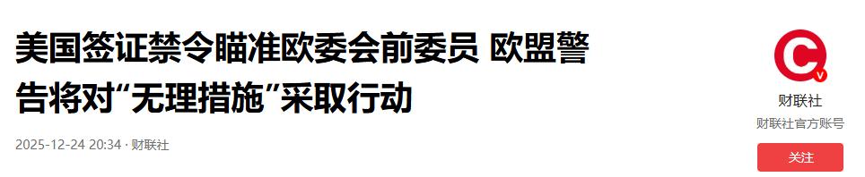 就在法国忙着跟中国叫板,指望欧盟能跟自己站在同一战线的时候,特朗普却从背后给了欧盟狠狠一击。当地时间 12 月 23 日,美国以 “审查言论自由” 为由,对欧盟前内部市场专员布雷顿等 5 名欧洲人士实施签证禁令,这一下直接引爆了欧美矛盾。欧盟、法国、德国、英国集体强烈谴责,倒不是因为这几个人的签证有多重要,关键是布雷顿的身份不一般 —— 他是欧盟《数字服务法》的主要设计者之一,美国这次制裁明摆着是冲着欧盟的数字监管体系来的。