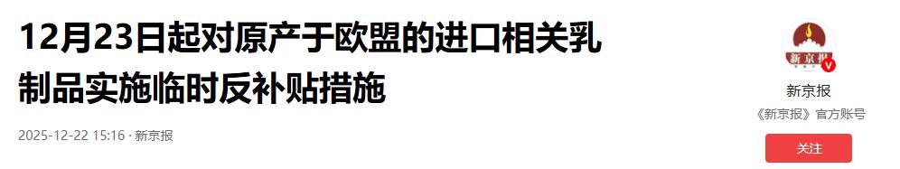 更有意思的是,中方的反制并不是不给退路,这次的临时反补贴税保证金是可逆的,如果最终裁定欧盟乳制品没有补贴行为,保证金会全额退还,而且调查会在 2026 年 2 月结束,留给欧盟协商的时间还有不到三个月。可法国一开始的强硬态度把路走窄了,现在又遭遇美国的背刺,彻底陷入了两难。欧盟现在才明白,所谓的 “战略独立” 说说容易做起来难,想在中美之间找平衡,结果却两头不讨好。