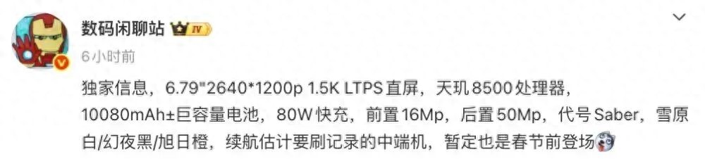 其将配备6.79英寸2640*1200p 1.5K LTPS直屏,内置10080mAh±大容量电池,支持80W快充,前置1600万像素自拍镜头,后置5000万像素镜头,代号Saber,提供雪原白/幻夜黑/旭日橙几款配色,续航估计要刷记录的中端机,暂定也是春节前登场。