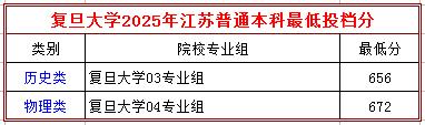 复旦大学2025年在江苏普通本科共招收121人,历史类、物理类各设1个专业组,具体招生专业及最低投档分见下表。