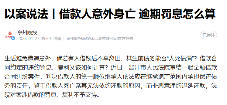 生活难免遭遇意外,倘若有人借钱后不幸离世,其生前债务能否“人死债消”?借款合同约定的违约罚息、复利又该如何计算?近日,晋江市人民法院审结一起金融借款合同纠纷案件,判决借款人的第一顺位继承人依法应在继承遗产范围内承担偿还债务的责任;鉴于借款人死亡系其无法依约还款的原因,而非恶意违约迟延还款,法院对案涉借款的罚息、复利不予支持。