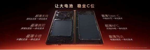 在内部设计方面,为了在极限空间里给电池留下足够空间,荣耀Magic V6针对内部空间做了系统性考量,对天线、音腔、卡槽、Type-C、NFC、马达等组件进行极致轻薄化处理,让电池稳坐C位。