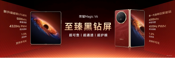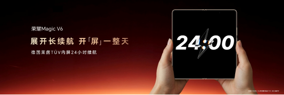 荣耀Magic V折叠屏系列自诞生之日起,就在不断刷新折叠行业品类上限。此次荣耀Magic V6不仅在极致轻薄上持续引领,更首次将折叠屏电池容量带入7000+mAh时代,续航实力跨代领先。内外均采用荣耀自研至臻黑钻屏,国际顶级七大权威认证诠释顶级屏幕素质。全新荣耀盾构钢铰链和超强整机防尘防水,将可靠性拉满。同时,凭借满血性能和出色影像配置,以及全新AI生产力和跨生态互联体验,带来从内核到外观,从硬件到软件的“折叠屏大满贯”实力。