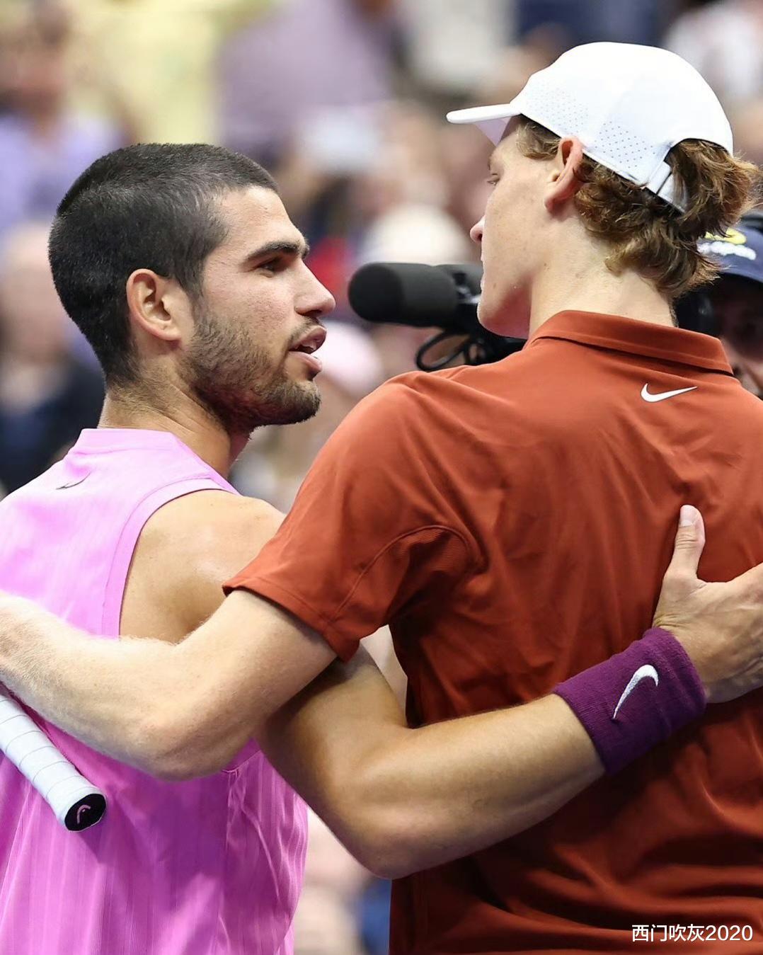 惺惺相惜!美网决赛后,阿尔卡辛纳携手走出赛场。颁奖仪式上,阿尔卡充满感情的对台下的辛纳笑着直言:“我见你比见我的家人都多!”