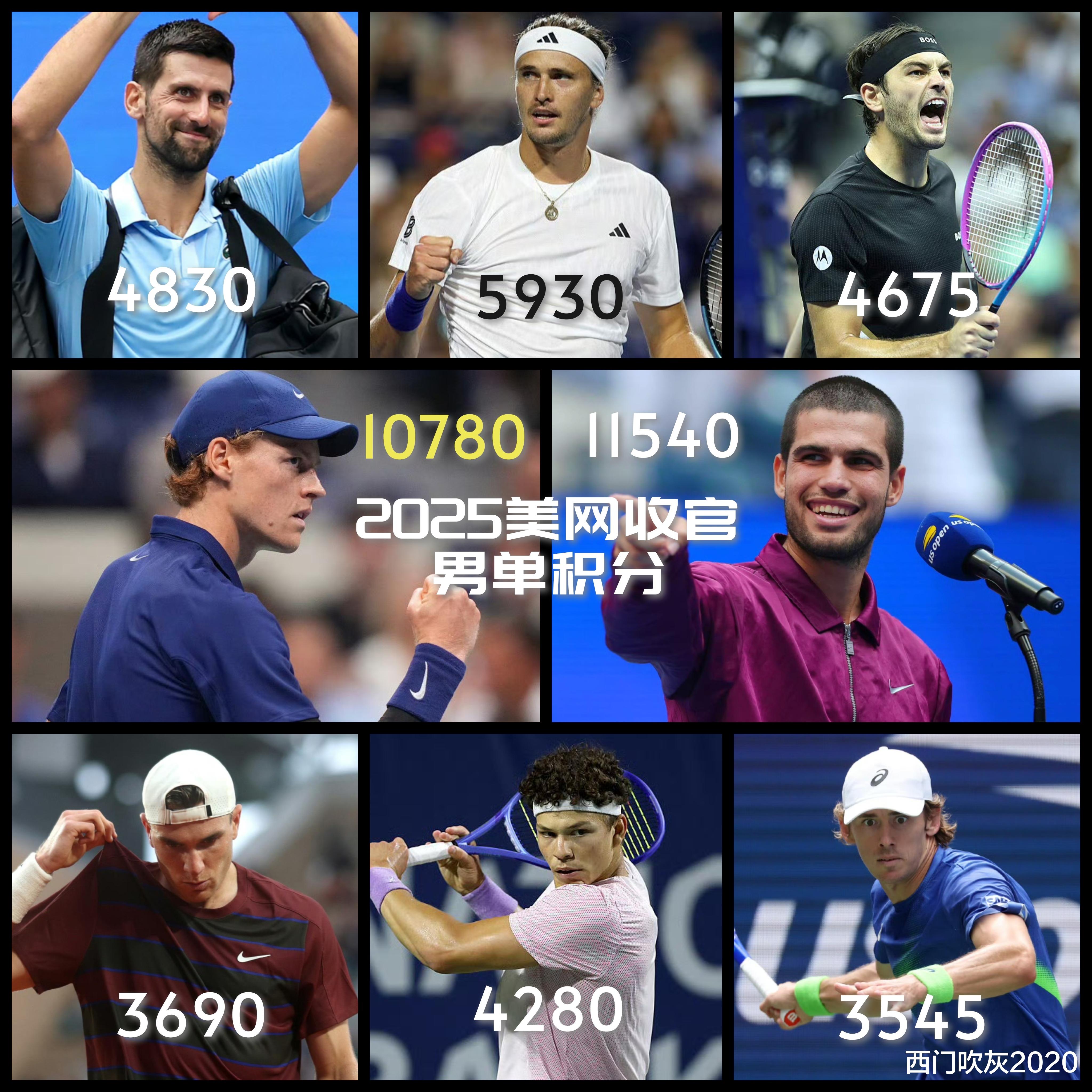 2025四大满贯收官,看如今的ATP男单排名,阿尔卡反超辛纳重回世界第一!阿尔卡和辛纳的积分双双过万,而排在男单世界第三的是九零后最出色的球员之一兹维列夫,他的积分只有5930分,相比辛卡矮了大半截!