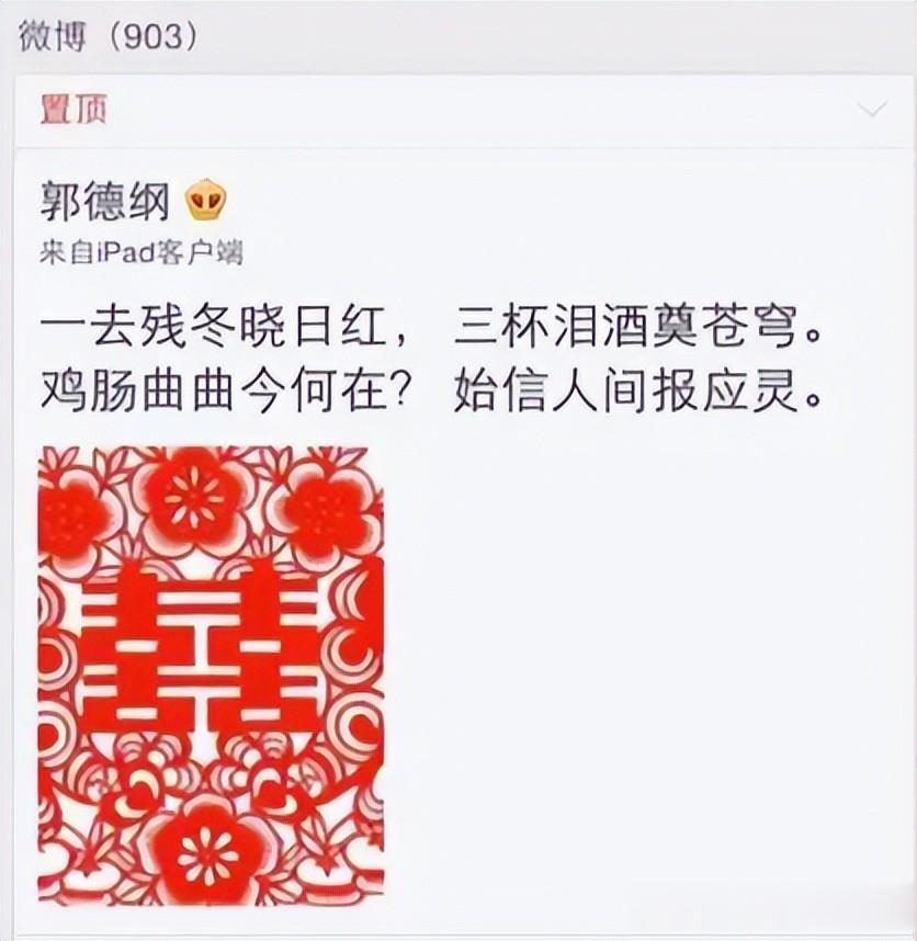 更让人难以接受的是,2013年北京电视台原台长王晓东去世后,郭德纲竟在微博发布带有“晓”“东”字眼的诗歌,还配上大红囍字置顶。