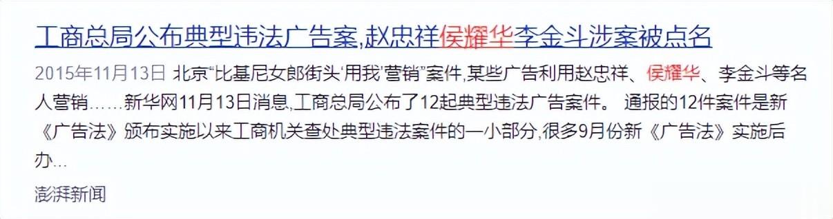 他曾在短时间内接连代言十则违法广告,涵盖保健品、收藏品等多个品类,几乎囊括了名人虚假代言的所有违法形式,被老百姓嘲讽为“侯药华”。