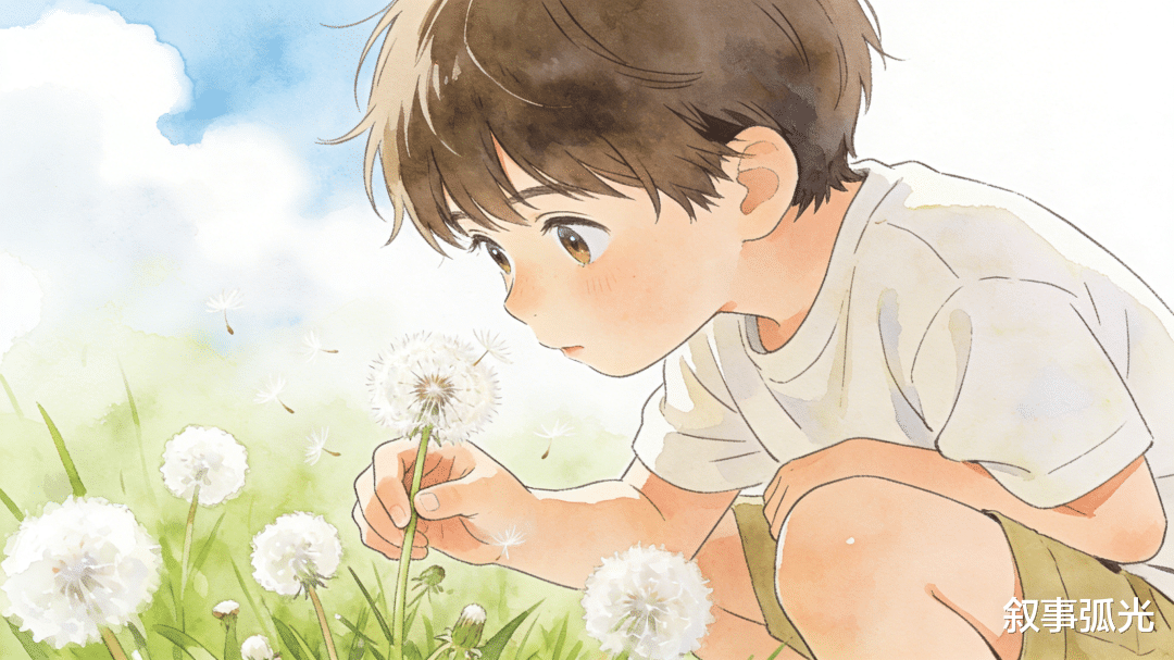 看他吹散蒲公英绒毛,叽叽喳喳说“妈妈你看,蒲公英在旅行呢”。