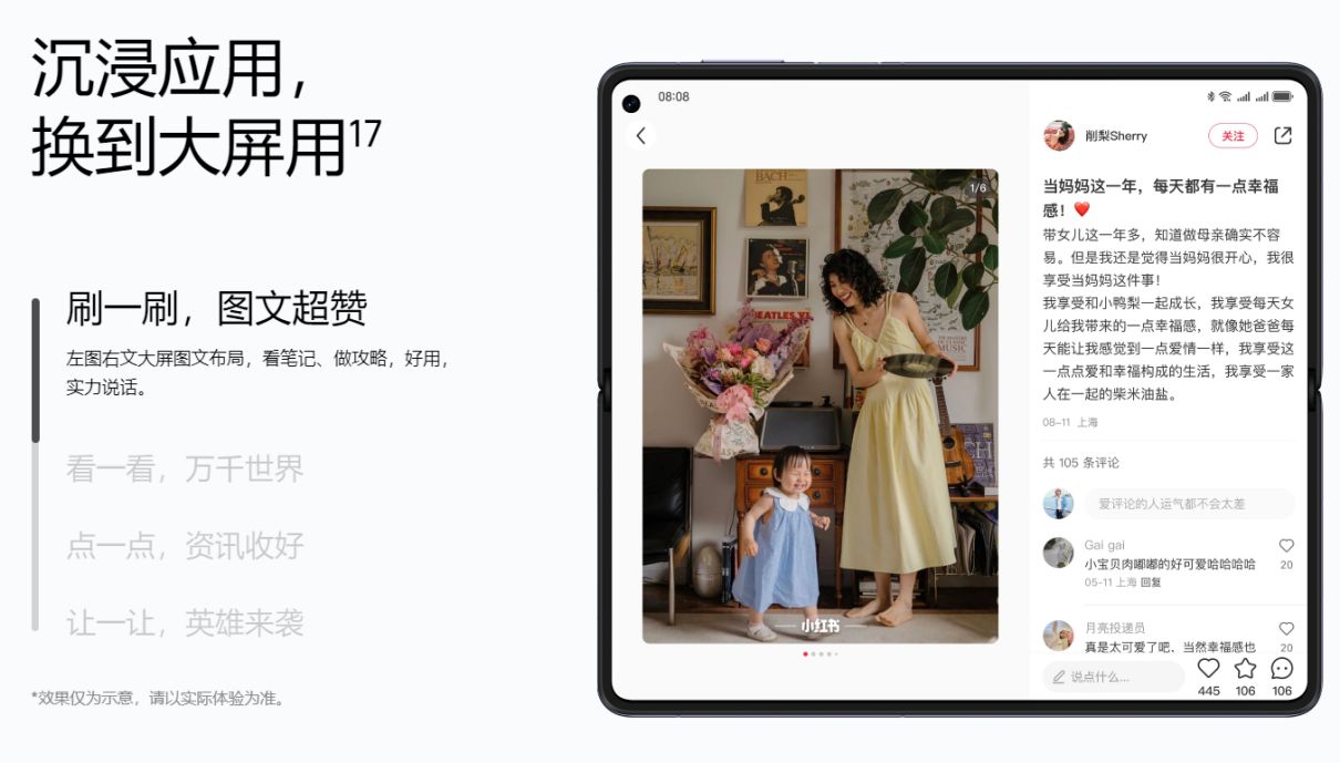 在系统优化方面,华为Mate X5的表现同样可以用行业标杆来形容。比如当使用华为Mate X5浏览小红书时,它会采用左图右文的大屏图文布局,这样无论是查看笔记还是制定旅行攻略,都变得异常便捷。还有刷抖音的时候,视频区和评论区直接分开展示,不会因为评论而遮挡视频内容。还有在游戏方面,华为Mate X5适配了《英雄联盟》手游,带来了更宽广的视野和更宽裕的操作空间,效果犹如物理外挂一般令人惊艳。此外,像可以解放双手的隔空手势操作,提升办公效率的超级中转站、跨屏拖拽等等创新功能,华为Mate X5都做到了全面适配。