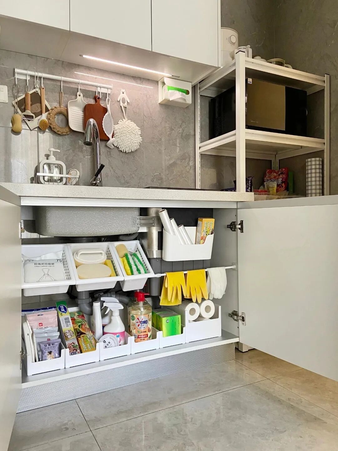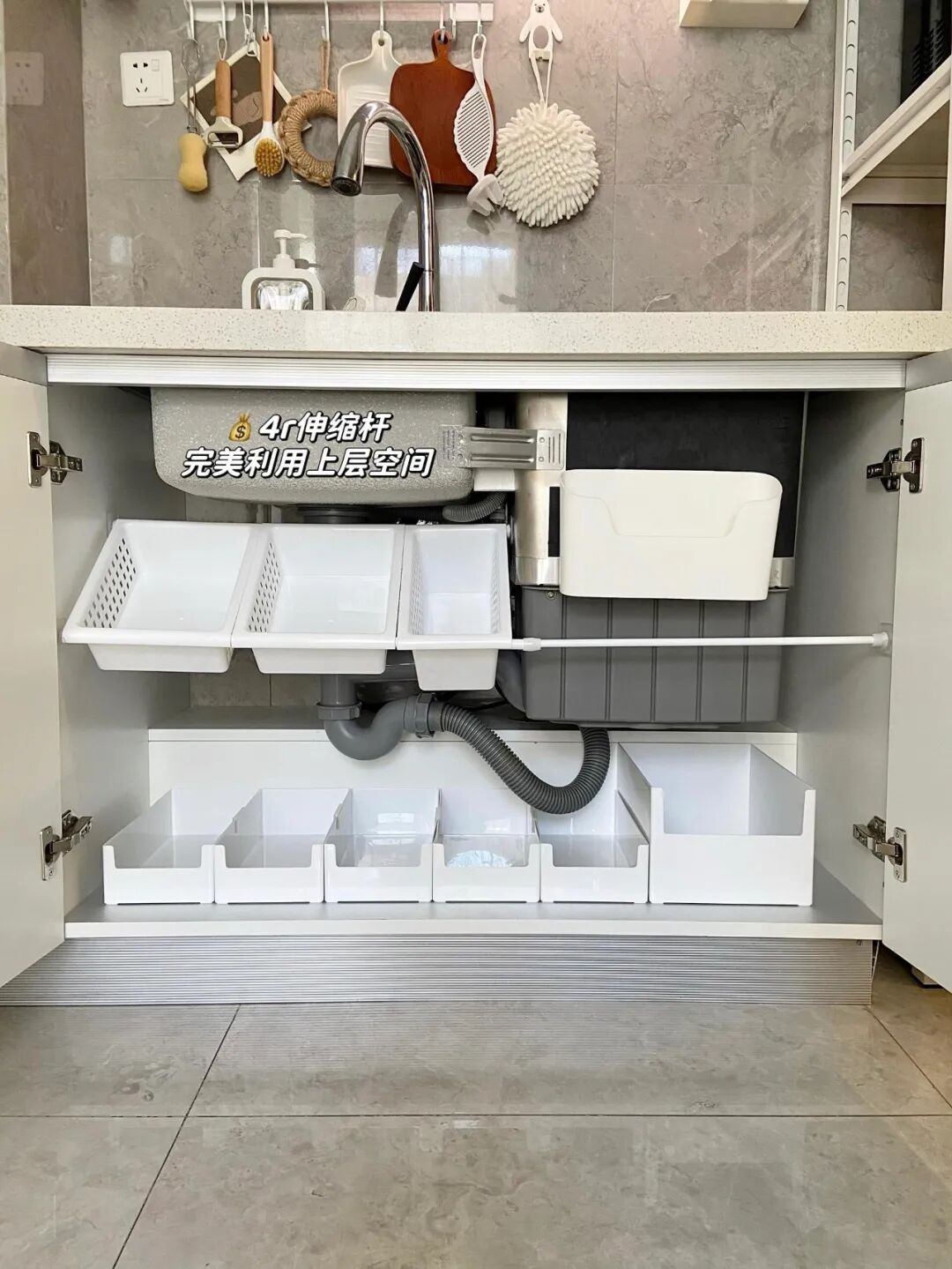 用几根伸缩杆+挂篮,就能打造分层收纳,清洁用品放得明明白白。