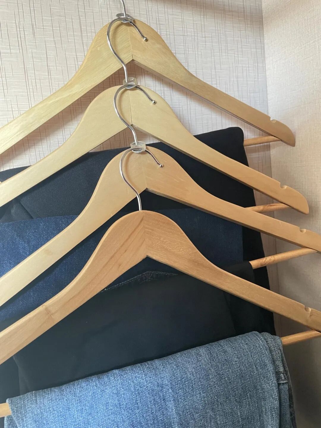 我试了下,把衬衫、裤子叠挂在拉环上,挂衣区瞬间被利用起来,衣服之间还不挤,拿取的时候也不会扯乱其他的,简直绝了。