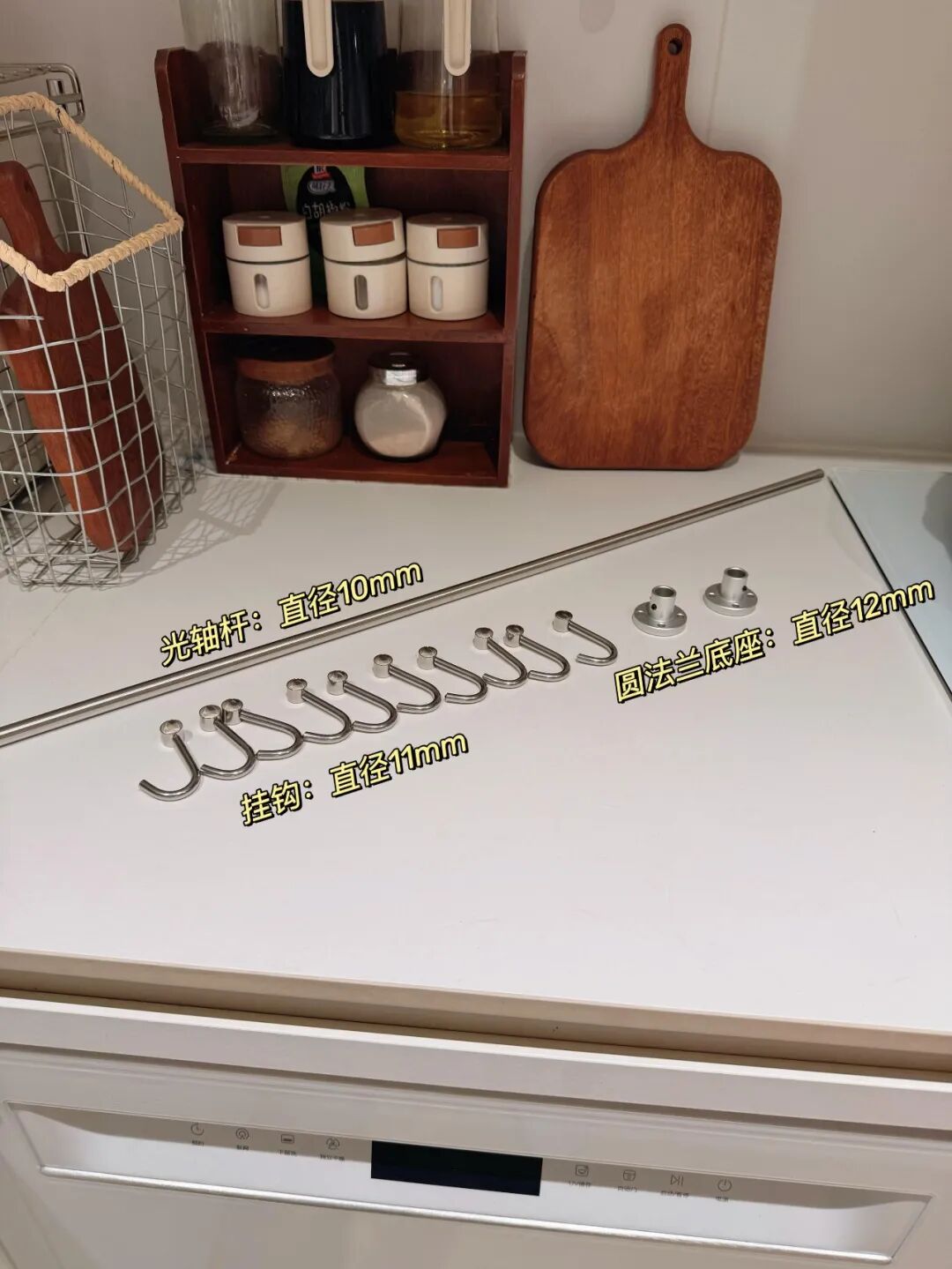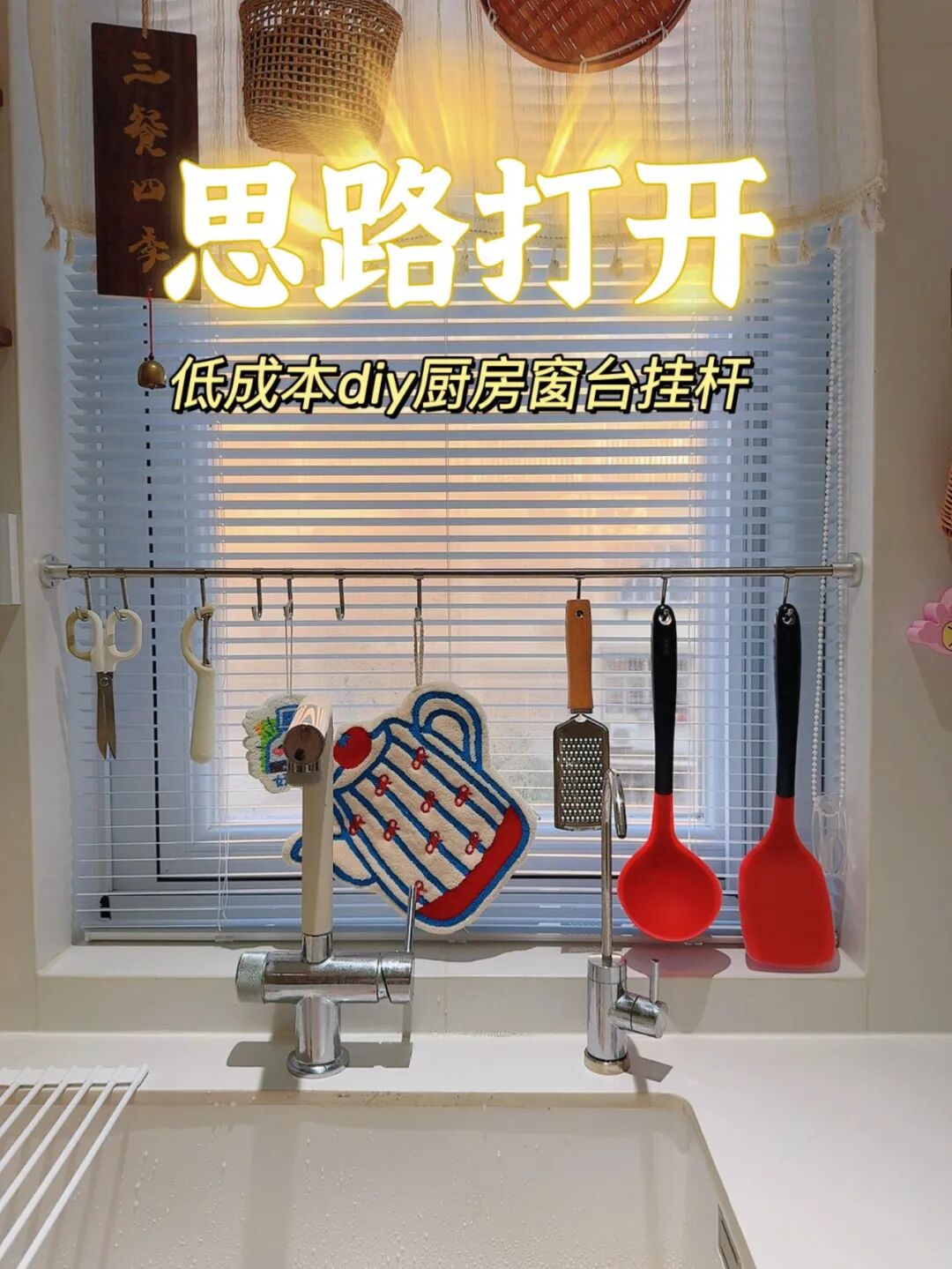 把伸缩杆顶在瓷砖窗框上,旋转绷紧,再挂几个S型挂钩,锅铲、小刮刀、清洁刷全挂上去,台面瞬间空出来了。
