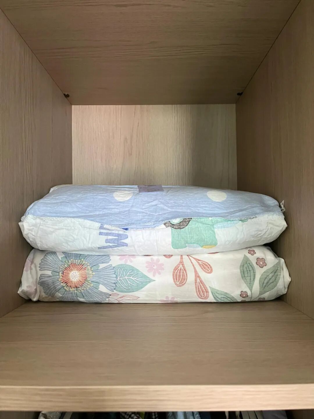 床单被套收纳很多人都做错了,叠在一起放衣柜,翻找的时候一抽就乱,抽一次疯一次。