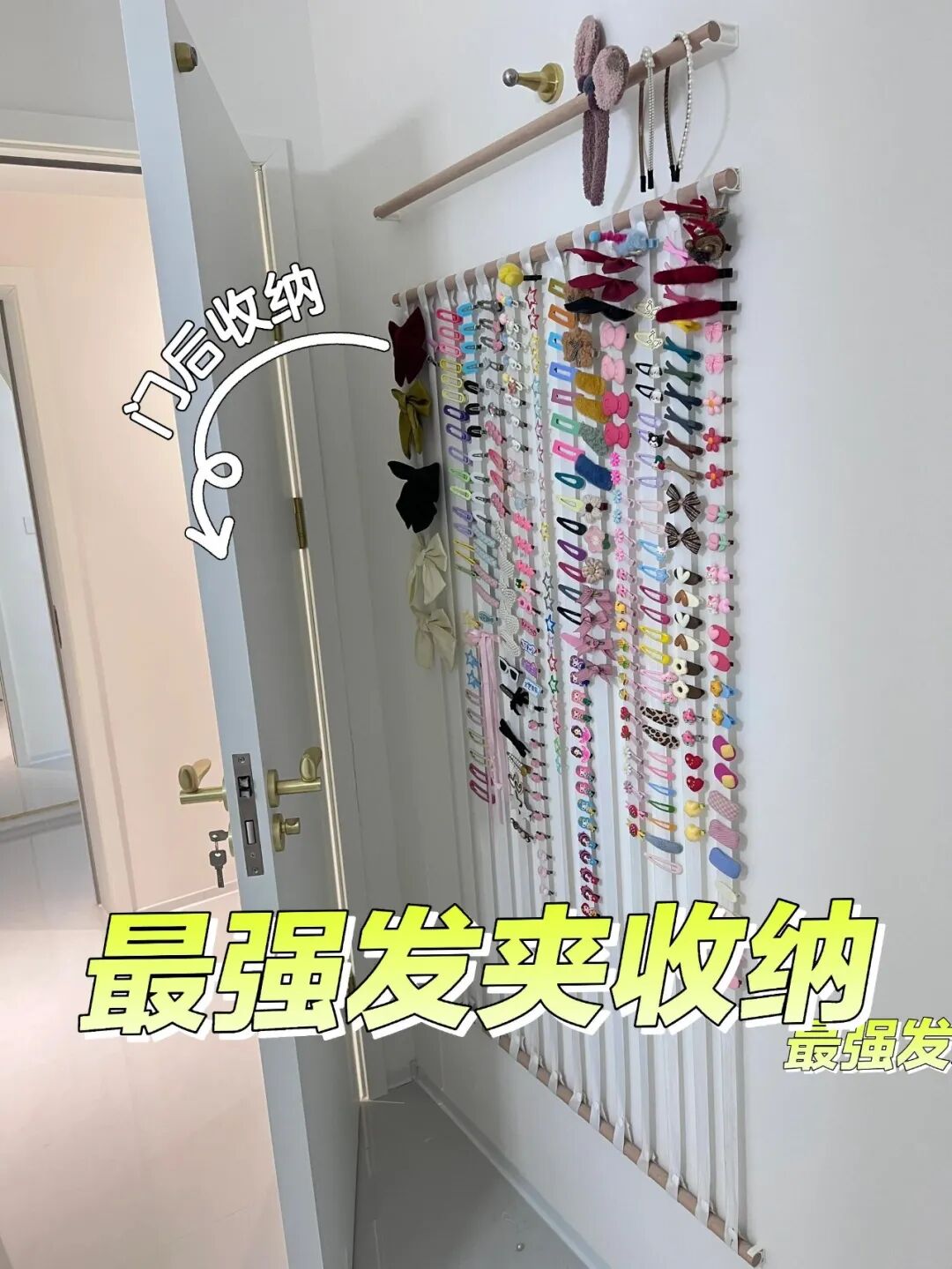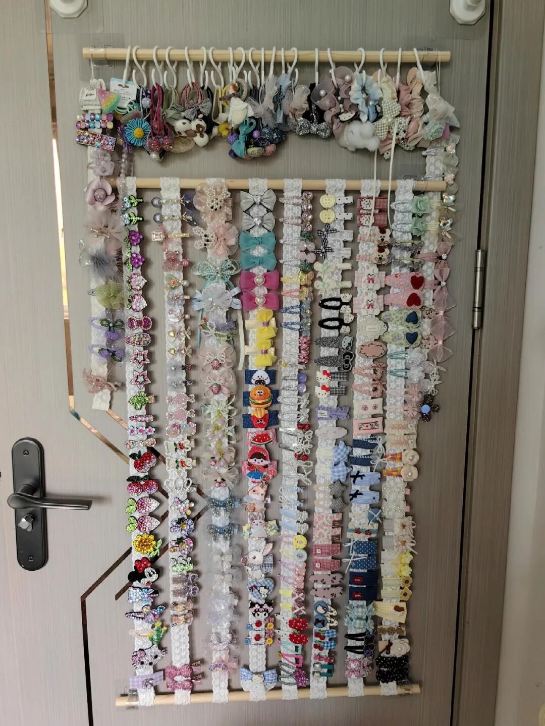 找两根木棍,再用几根不用了的飘带或者蕾丝带绑上,然后用挂钩挂在门背面或者柜子里,所有发夹一排排夹上去,清清楚楚、明明白白。