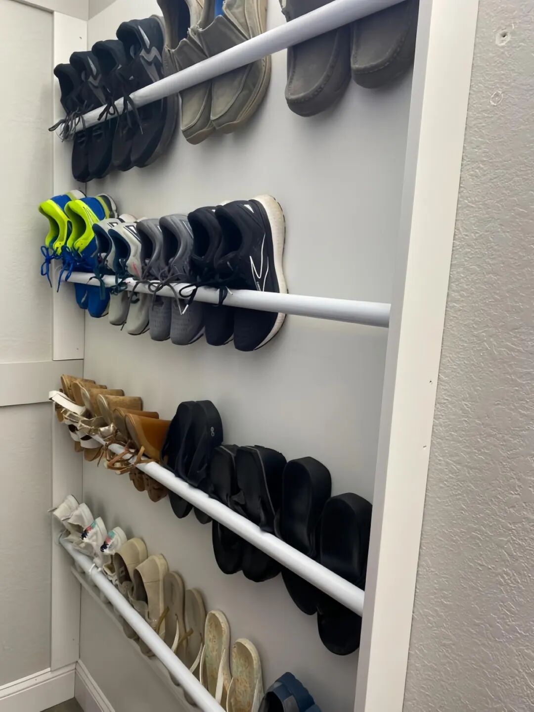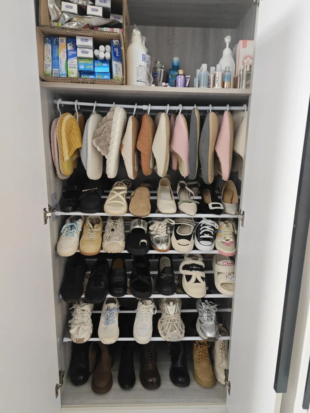 鞋子太多放不下,或者鞋柜尺寸不对,放几根伸缩杆,把鞋子分层放,瞬间多放好几双。