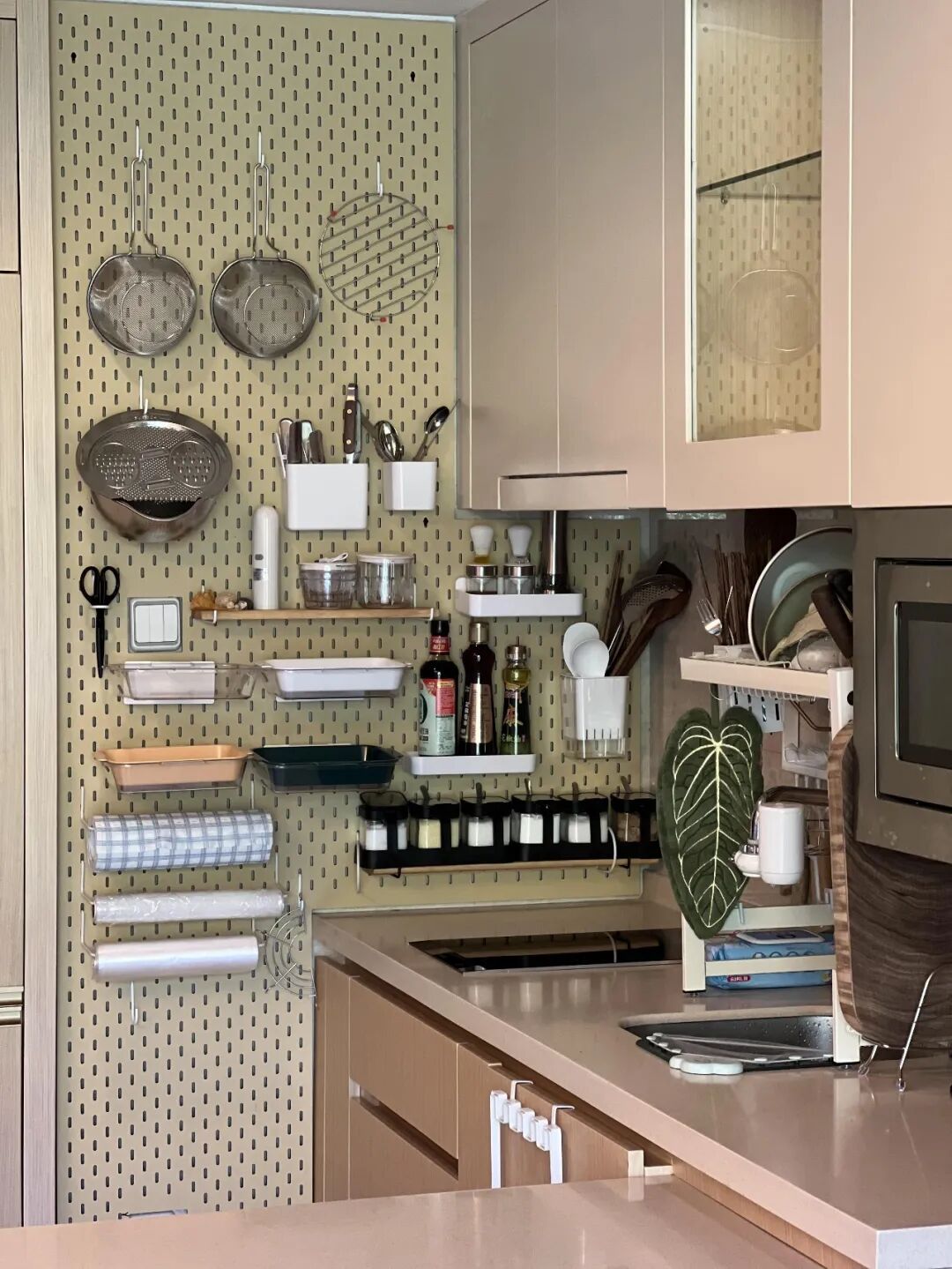 关键洞洞板可以自己DIY,网上买块基础板,再配点挂钩、搁板,几十块就能搞定,比起定制收纳柜便宜太多了。