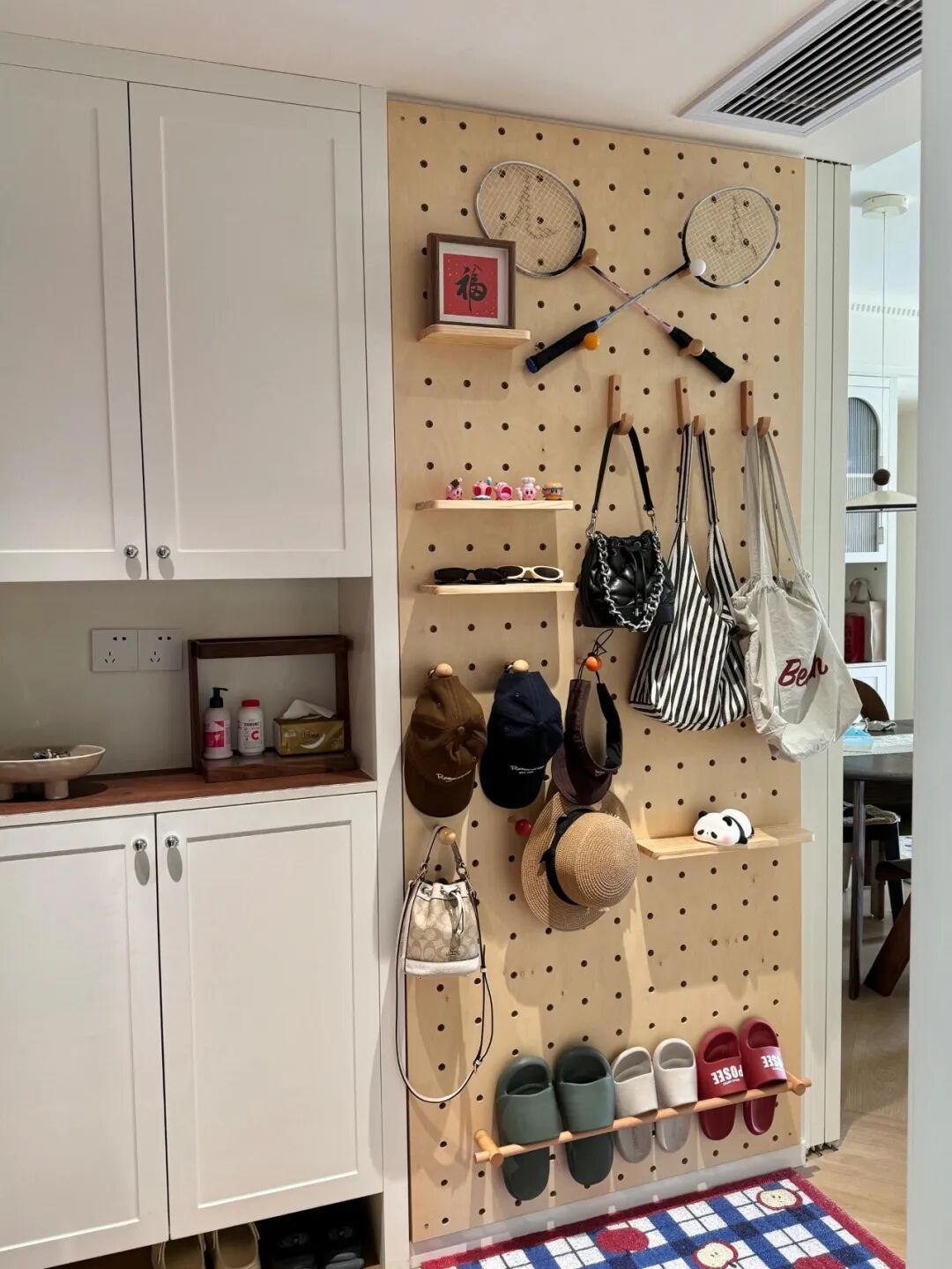 现在年轻人家里几乎都有洞洞板,这玩意儿简直万能,玄关装一块挂钥匙、包包、衣服。