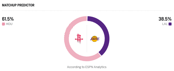 对于湖人和火箭年终大战,ESPN对本场胜率进行了预测,火箭胜率高达61.5%,主场作战的湖人胜率仅38.5%;目前湖人和火箭均遭遇2连败,湖人19胜9负排名西部第4,火箭排名西部第6,两队仅仅只差1.5个胜场,这也是一场关键的排名卡位战。