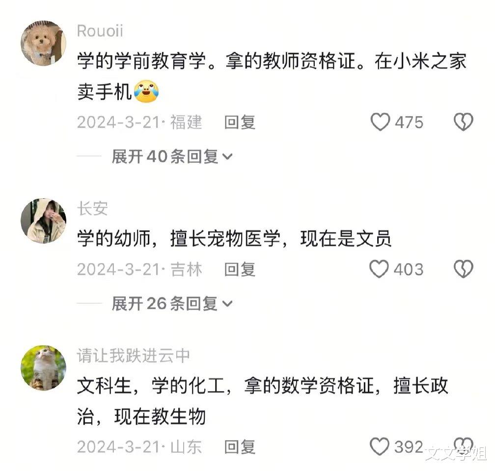 谁懂啊!大学选专业时精挑细选,汉语言盼着伏案执笔,计算机想着敲码成师,会计盯着报表深耕,以为敲定了人生赛道,毕业踏入职场才发现,专业和工作居然毫无交集。这种离谱错位在各行各业都在上演,荒诞又真实。