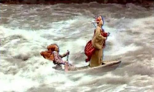 西天取经走到黑水河,唐僧师徒正商议怎么过河,这时候上溜头有一人棹下一只小船儿来,无奈这是一只独木舟,只能做两人,唐僧和猪八戒上去,走到中间就被捉住了。
