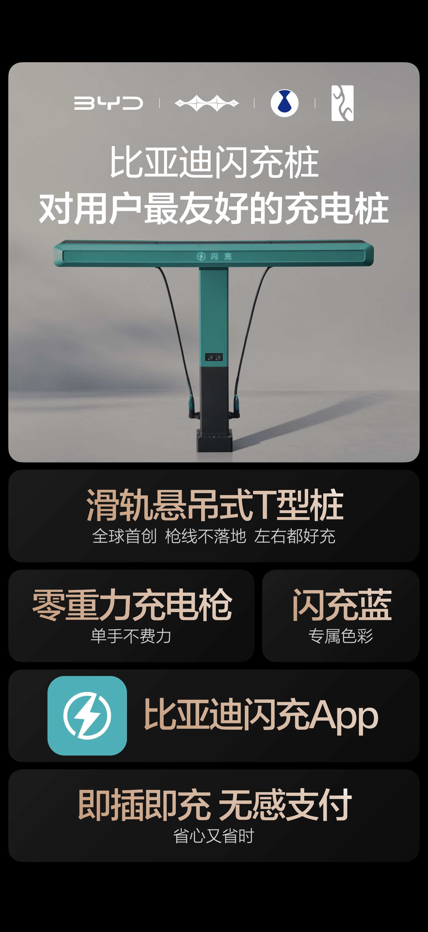 另外,闪充桩设计也很懂车主,滑轨悬吊式T型桩配零重力充电枪,拿取轻松不脏手,左右充电口都适配,即插即充+无感支付全程不用碰手机,腾势等多品牌都能用。