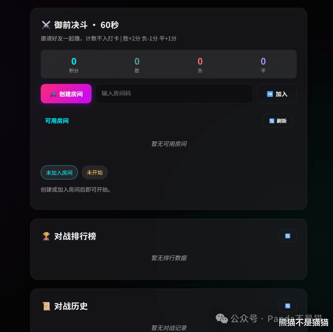 房主可以创建房间,其他人凭房间码进入,主打一个「来者不善」。具体的操作熊猫这里因为只有一个人没办法操作,各位感兴趣可以和你的小伙伴PK试试。