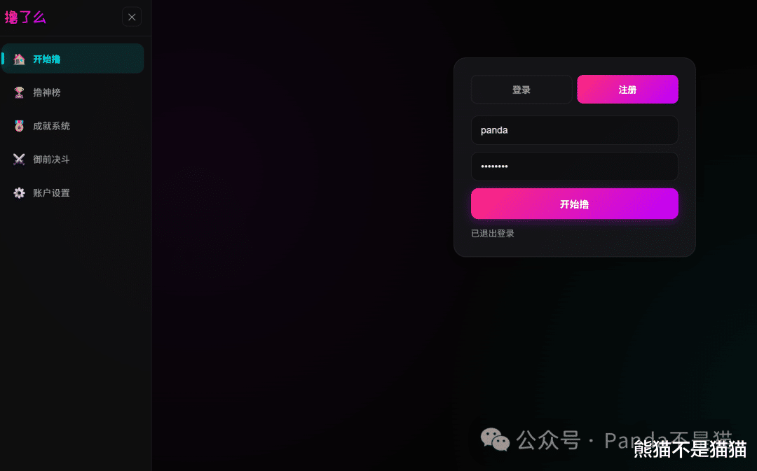 项目预览首先,项目有账号系统,独乐了不如众乐乐嘛好东西,就得大家一起「撸」才带劲!左边能看到开始、榜单、成就、PK系统以及账号设置,这些后面一个一个说。