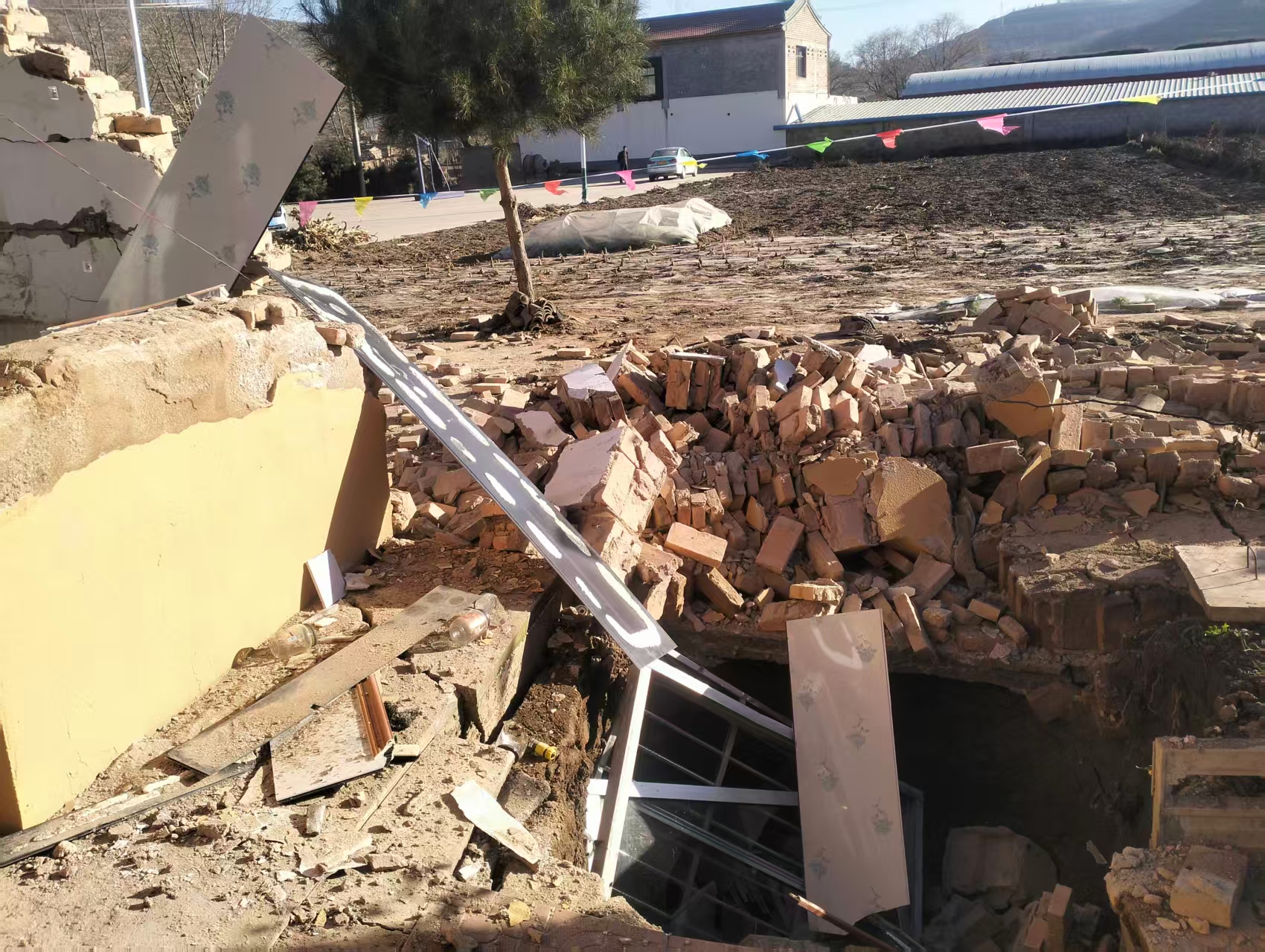 没过多久,院子西侧地面大面积塌陷,三间砖木结构住房随之倾斜坍塌,屋内家具、衣物、粮食等生活物资全被废墟掩埋,幸无人员伤亡。紧邻的两名80余岁独居老人住房也同步受损,墙体开裂、屋顶渗水、地面沉降,沦为随时可能二次坍塌的危房,而行动不便、子女不在身边的老人,至今未获有效安置。