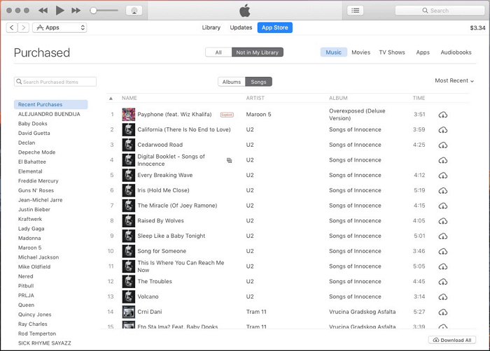 步骤 5. 点击 iTunes 左侧的“最近添加”,选择要保存的已购买音乐,然后点击“下载”按钮传输音乐。