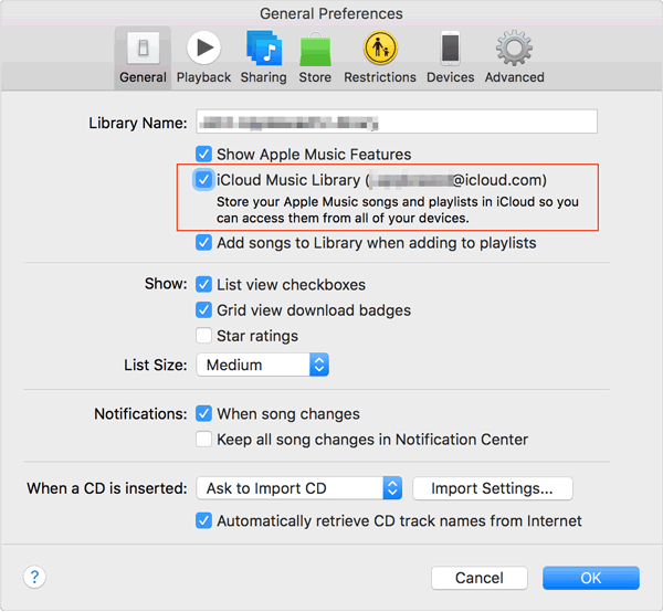 步骤 2. 在电脑上,在Windows中,从“编辑”>“偏好设置”部分启用“iCloud 音乐库”选项;在Mac中,在“iTunes”>“偏好设置”部分进行检查。