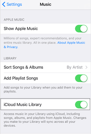 步骤 1. 打开 iPhone 上的“设置”,然后选择“音乐”。开启“iCloud 音乐资料库”。当弹出窗口出现时,选择将音乐保留在 iPhone 上,以便将歌曲添加到 iCloud 音乐资料库。