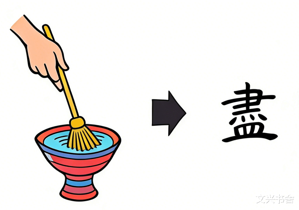 如此一来,繁体“盡”作为会意字的妙处便一目了然——它的本义,就是食器中的食物被吃得一干二净。《说文》有云:“盡,器中空也。” 回溯商周时期的甲骨文、金文,“盡”字的字形活脱脱就是一幅生活图景:一个人手持扫帚(或刷子),正细细刷洗空了的食器。要知道,“空、尽、无”这类抽象概念,在远古时期极难用文字表达,而古人竟能借“刷洗空食器”这一生活化场景,将其具象化,这份造字的智慧,实在令人叹服。