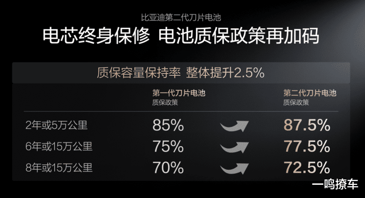 有技术底气,质保政策自然也敢加码。第二代刀片电池把质保的容量保持率整体提了2.5%,就拿6年或15万公里的质保来说,第一代是容量低于75% 免费换,第二代直接降到 77.5%,稍微衰减点就能享免费服务,对车主来说太实在了。更让人放心的是,电芯还给终身保修,从买车开到换车,电池的事儿都有兜底,这波承诺直接给车主吃了定心丸。