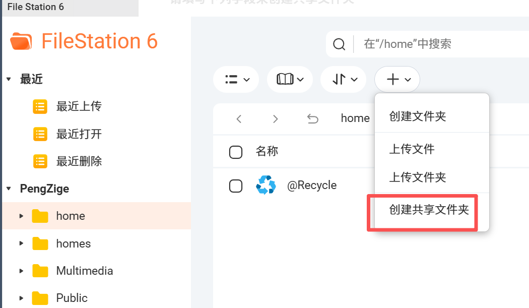 创建团队文件夹▼打开File Station 6,点击加号,创建共享文件夹。