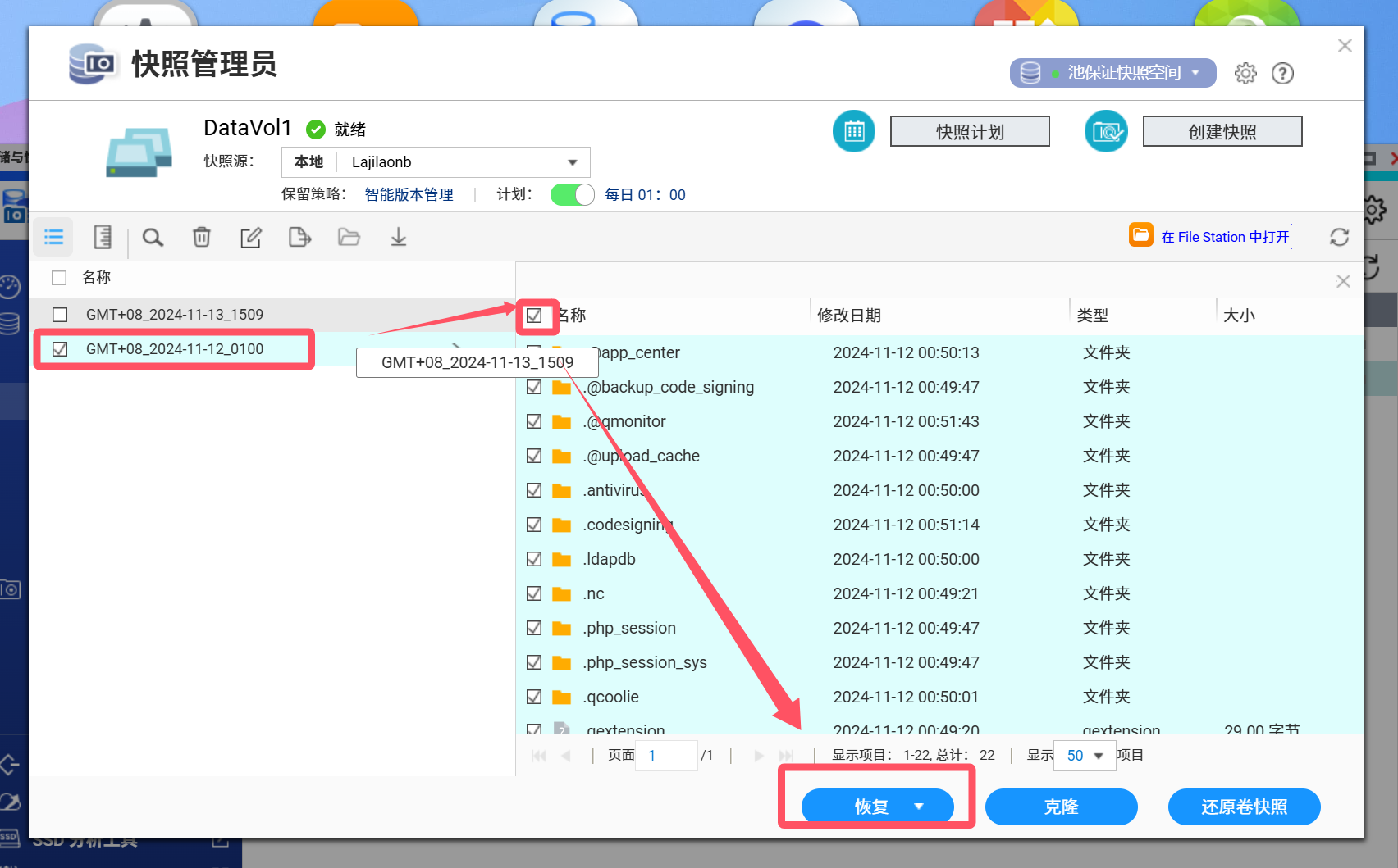 ▼需要进行数据恢复的时候,只需要在快照管理员中双击快照即可,全量恢复或者恢复单文件、单文件夹都可行。