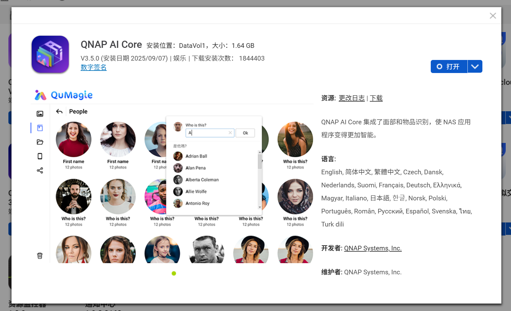 ▼语义搜索需要安装QNAP AI Core,要求最小内存8GB,随着AI在NAS上的应用越来越多,内存容量也显得越来越重要,建议大家采购NAS时,直接上16GB,或者采购8GB直接升级32GB。