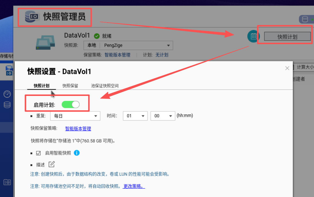 ▼进入快照管理员功能,还可以进行定时快照,这样即便发生员工误删除文件或者是碰到了勒索病毒,也能保证数据安全。。