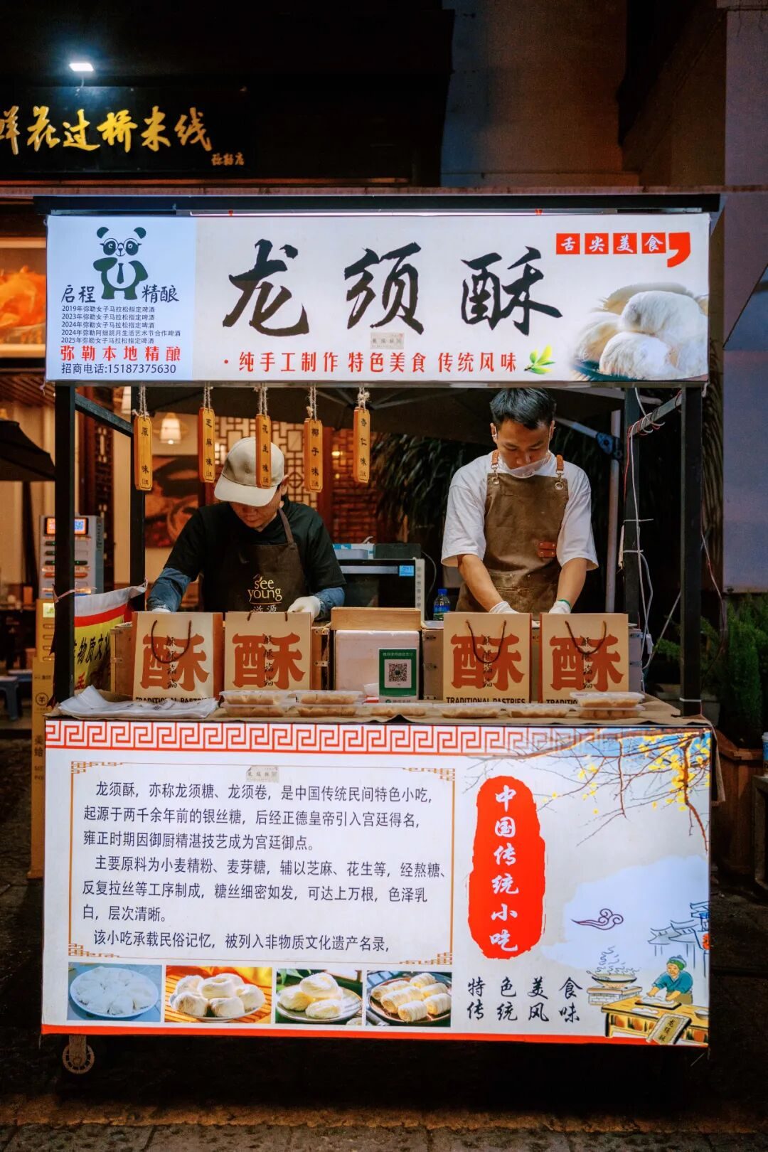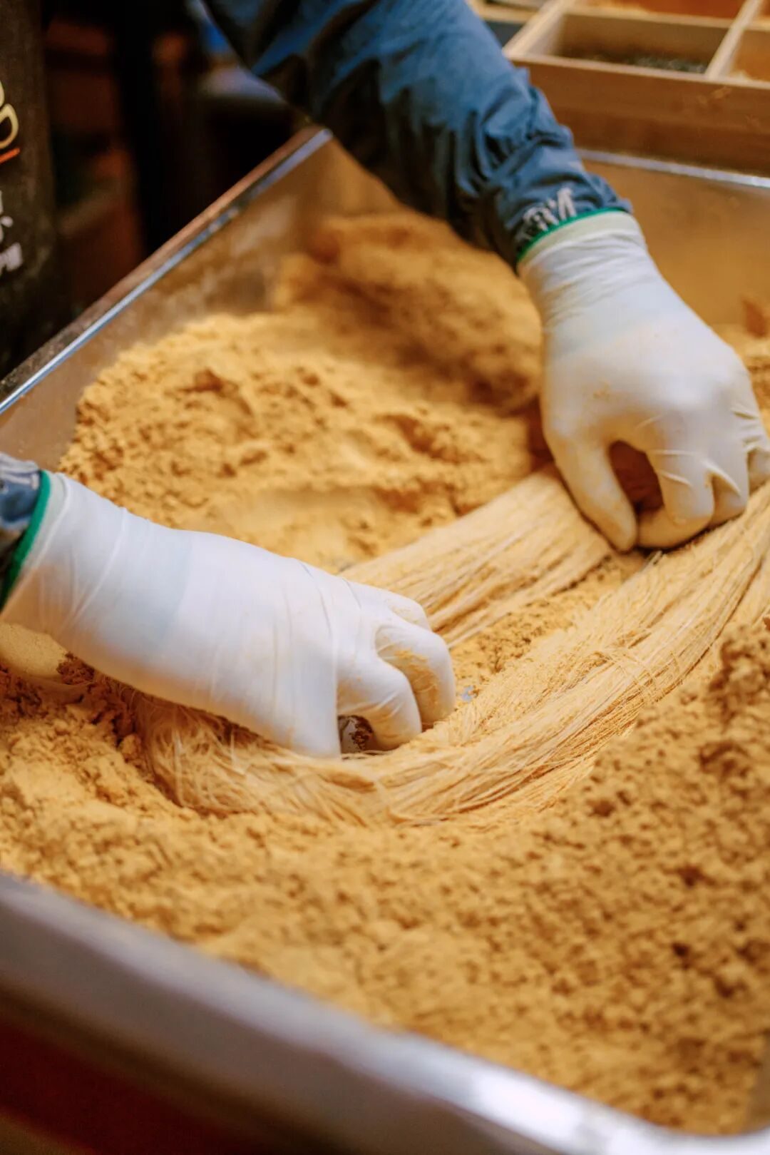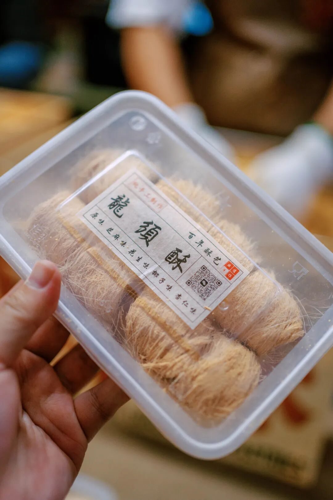 手工拉制的龙须酥简直是视觉味觉双重享受!师傅现场表演 “抻糖丝”,原本硬邦邦的糖块被拉成千万根细如发丝的糖丝,这手艺看得人目瞪口呆!