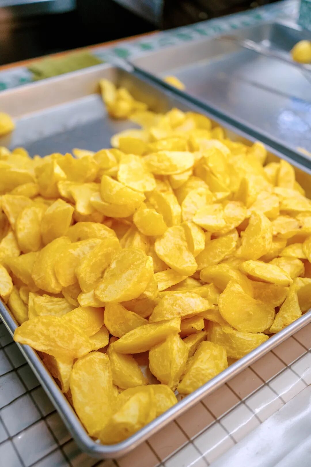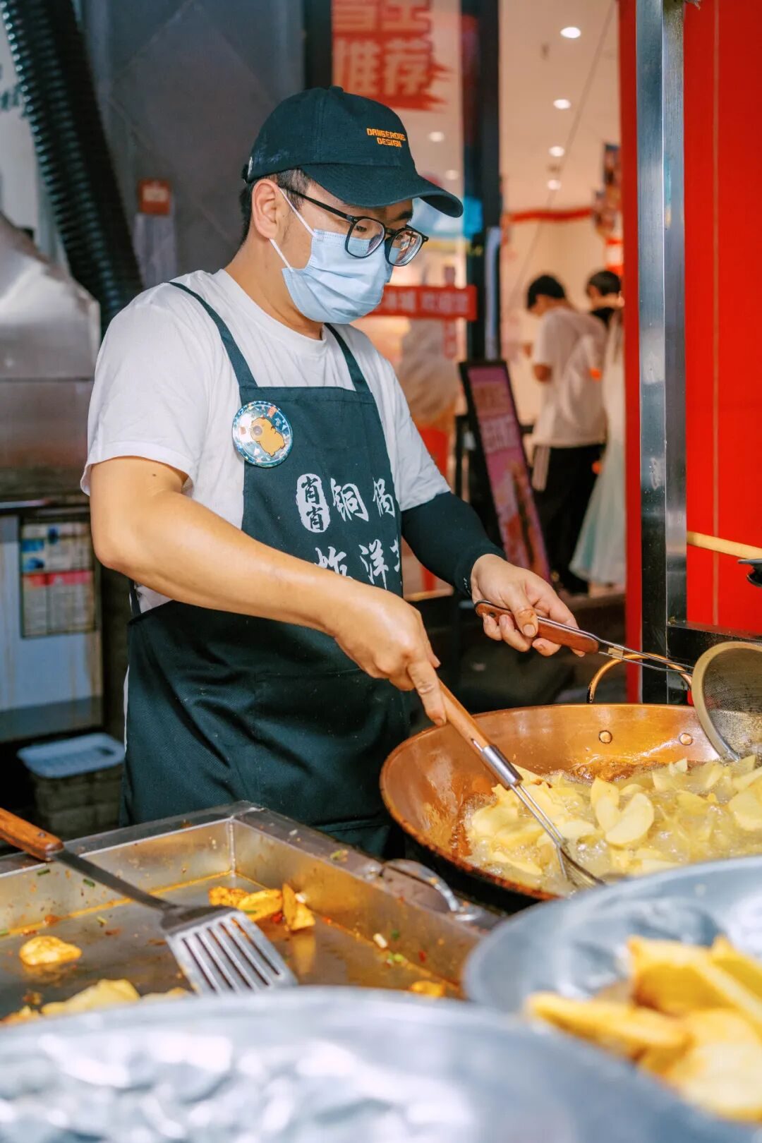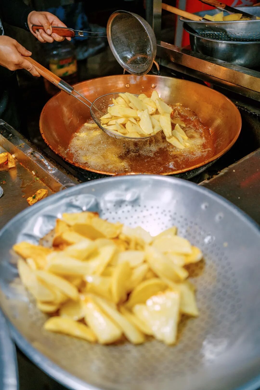 用铜锅炸洋芋,讲究「铜锅慢火,油净如新」。这家的油,每日一换,绝不过夜。洋芋片下锅炸两道:第一道锁住水分,第二道逼出酥脆。