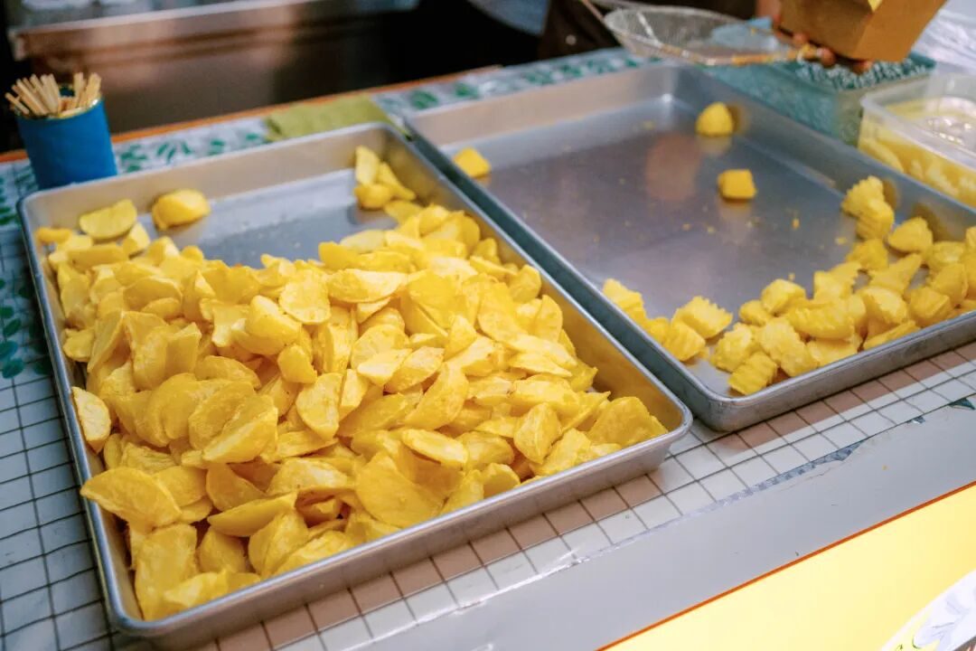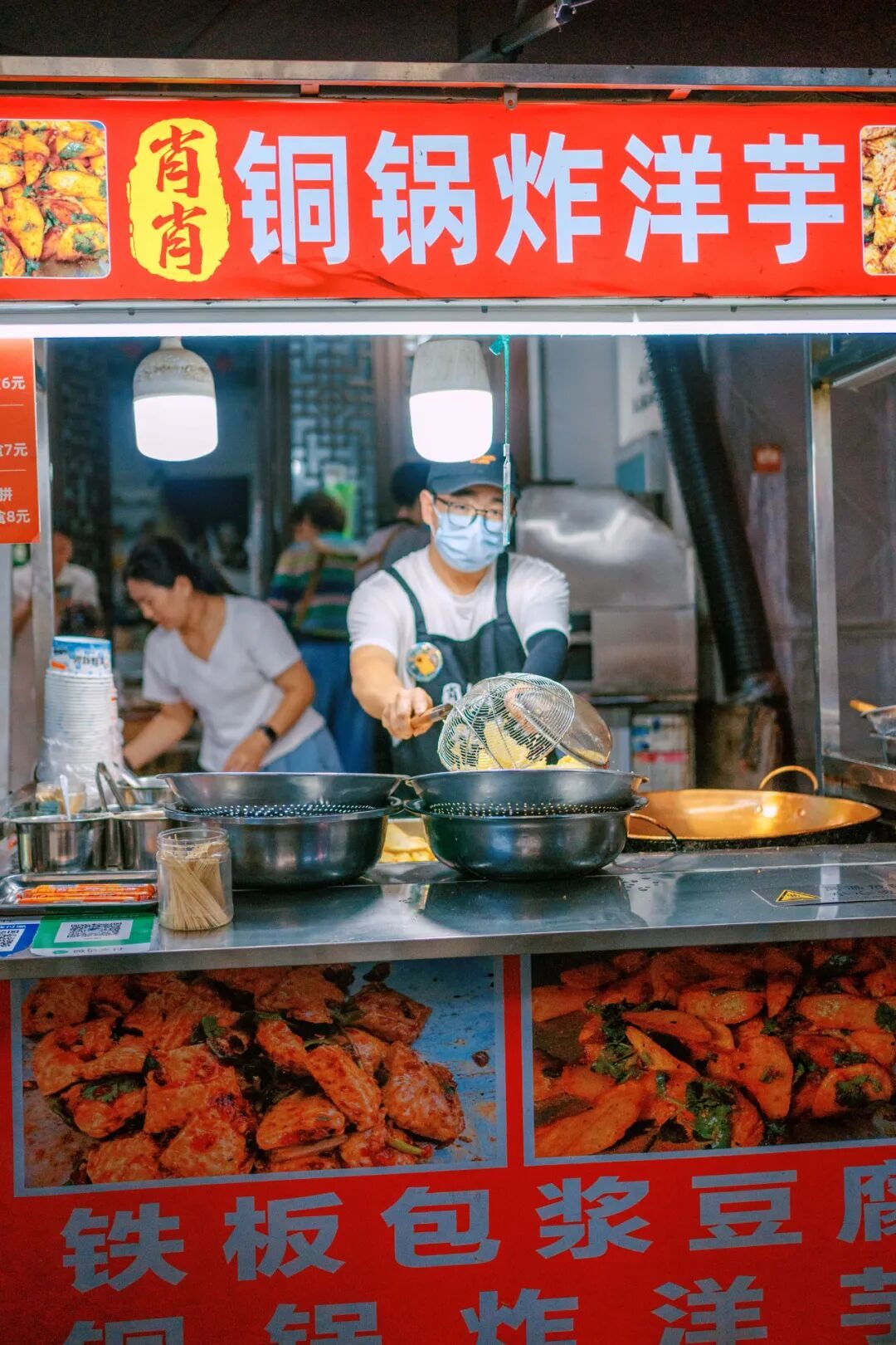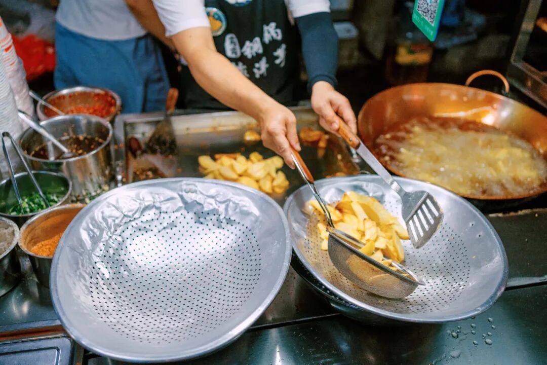 用铜锅炸洋芋,讲究「铜锅慢火,油净如新」。这家的油,每日一换,绝不过夜。洋芋片下锅炸两道:第一道锁住水分,第二道逼出酥脆。