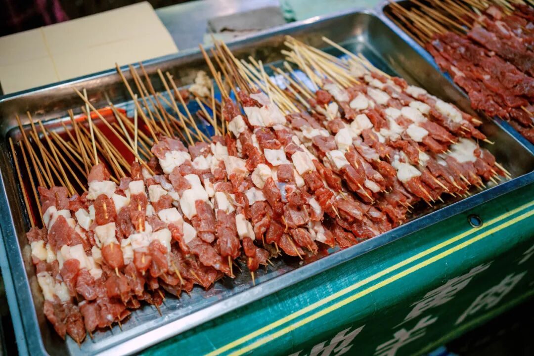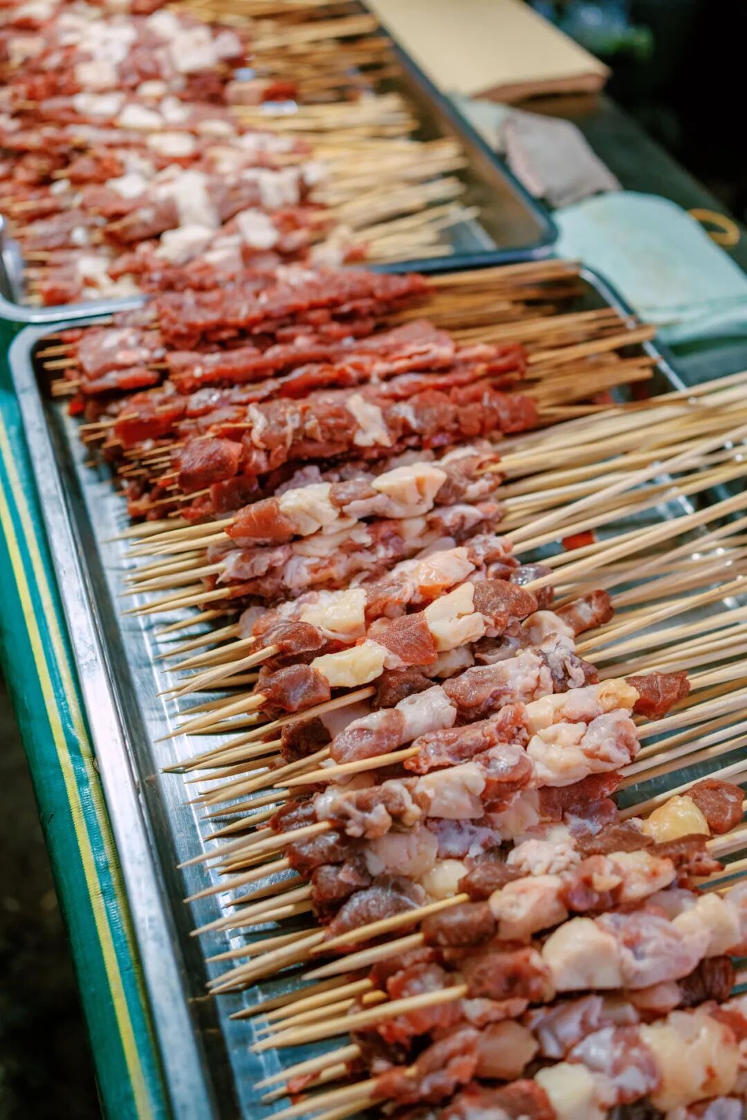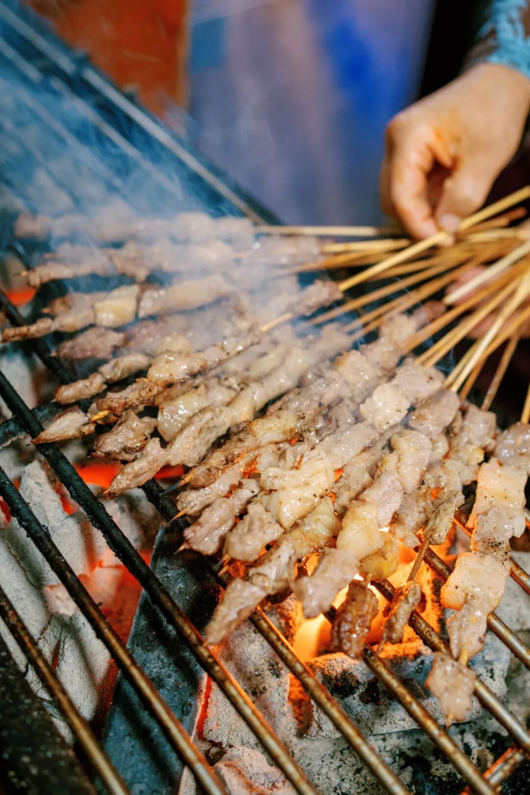 肉串快速翻烤到微焦,才能锁住里面的肉汁。咬下去的瞬间,肉香混着炭火气在嘴里炸开。牛肉的纤维里还藏着滚烫的肉汁,吃完还留下满口香。