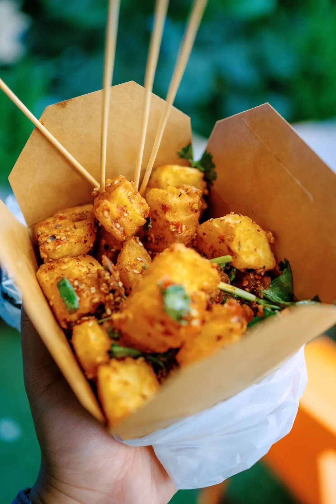 最妙的是出锅后还用热铁板炒拌,铁铲翻飞间,佐料的香气钻进洋芋的孔隙里。咬开金黄的外壳,里面是绵密起沙的土豆,各种佐料的香在嘴里交织,口感实在太上头。