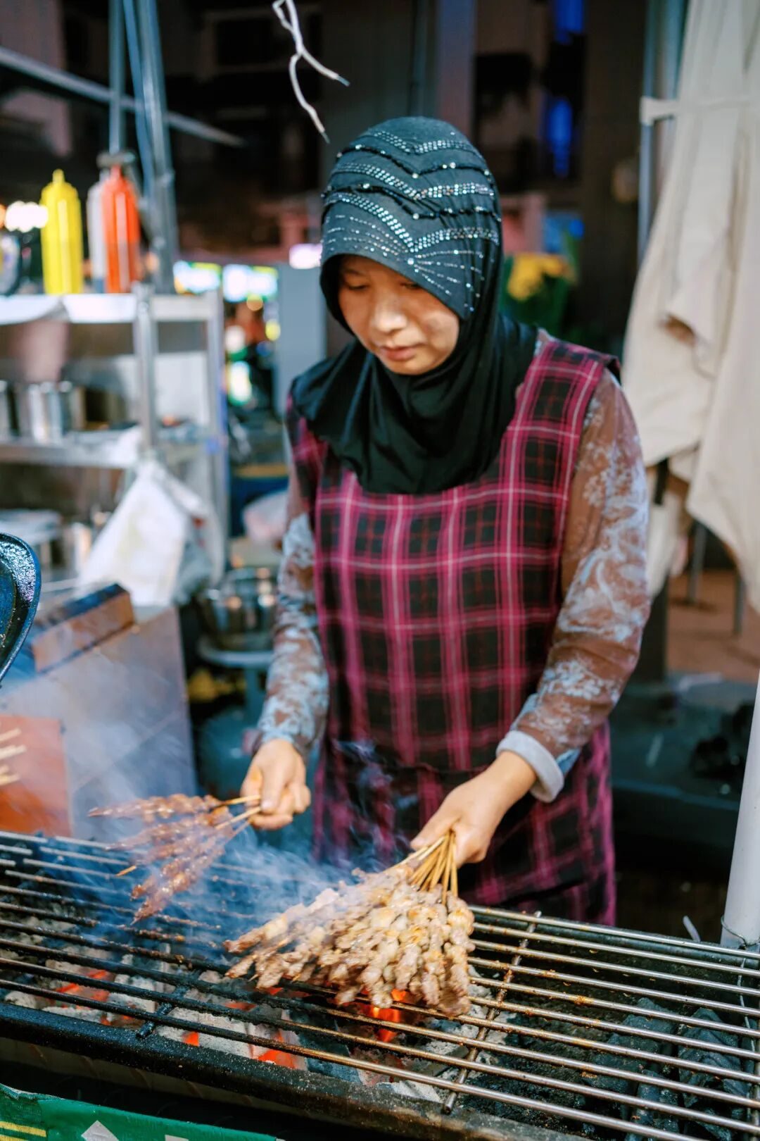 铁架上的牛肉串滋滋冒油,炭火舔着肉块,烤出的油脂滴在炭上,腾起一阵阵带着肉香的烟雾。这是家是在沙甸开了10 多年的老摊,只用自家宰的黄牛肉,究的就是一个“鲜”字。
